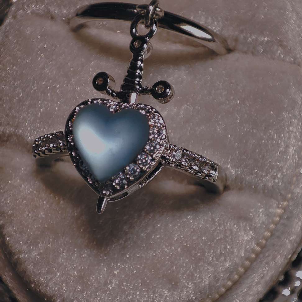 この2本のリングは2つセットでひとつは剣を象り、もうひとつは青く透き通るハートを抱いたデザインです。重ねてつけると剣がハートを貫く構図になり、離してつければそれぞれが独立したモチーフとして存在感を放ちます。