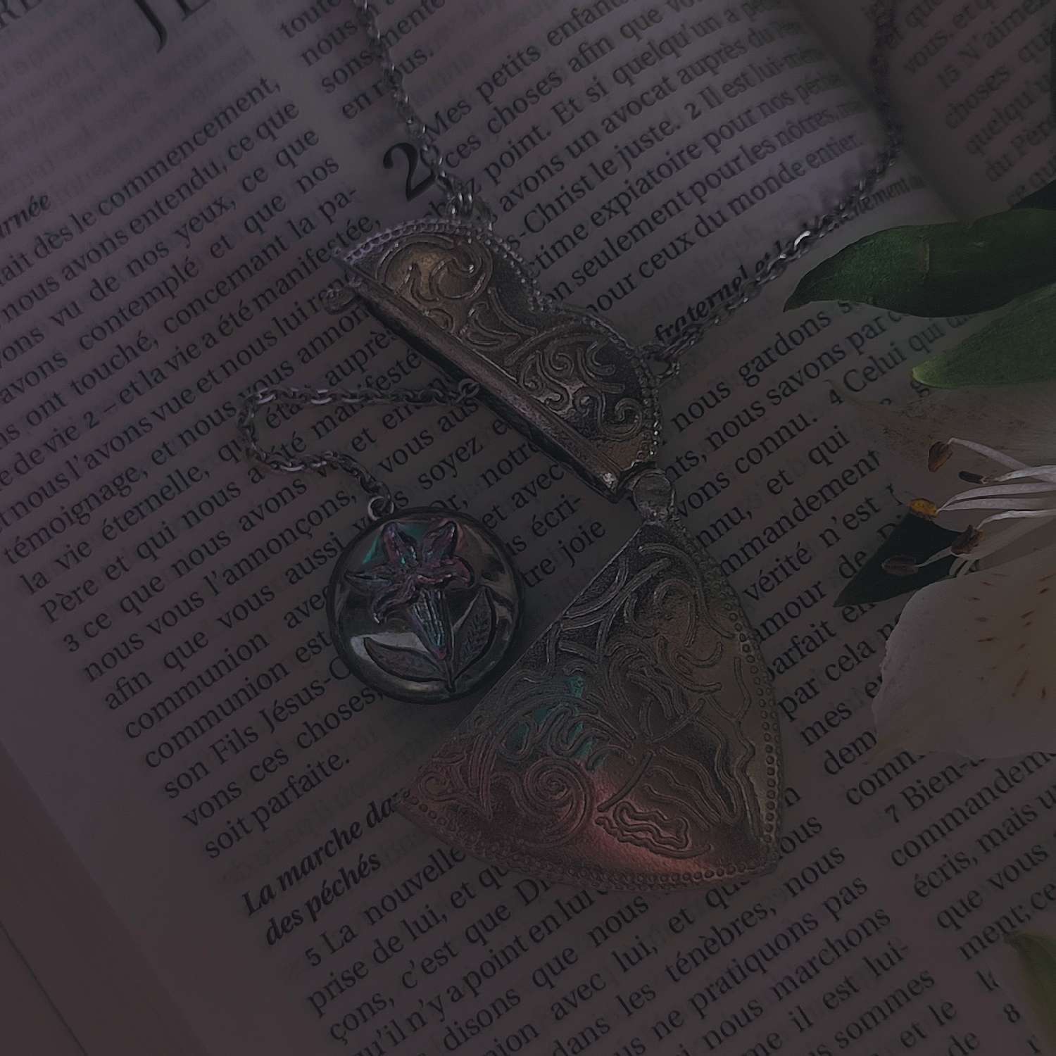 「憂いの篩」のロケットペンダント。心の奥に沈むものをそっと濾し取るように、秘めた想いを閉じ込められるものです。