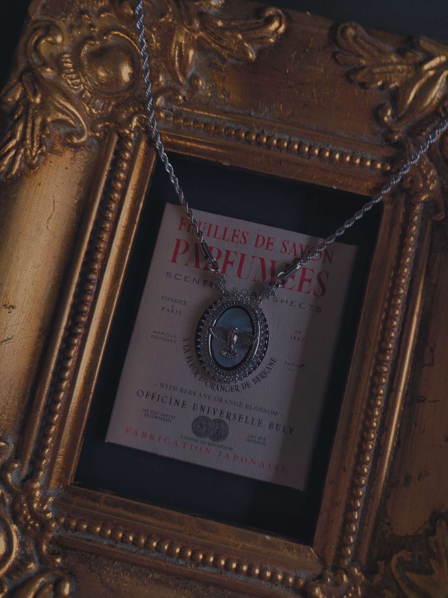 静かな祈りを胸に宿すようなネックレスです。中央にはマザーオブパールを背景に、翼を広げた鳩の姿を象りました。その周囲を小さなジルコニアが取り囲み、光を受けるたびに空に舞う羽音のようなきらめきを添えてくれます。