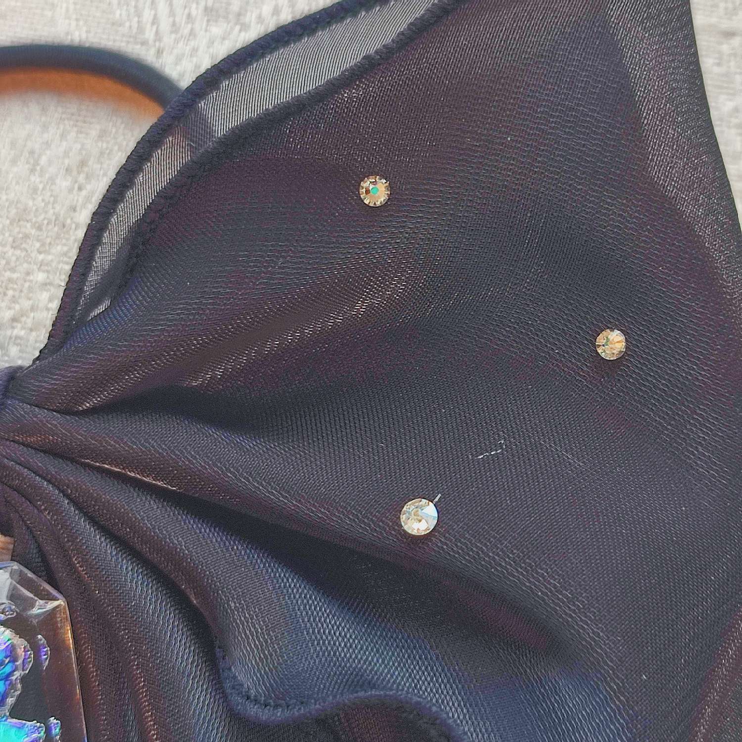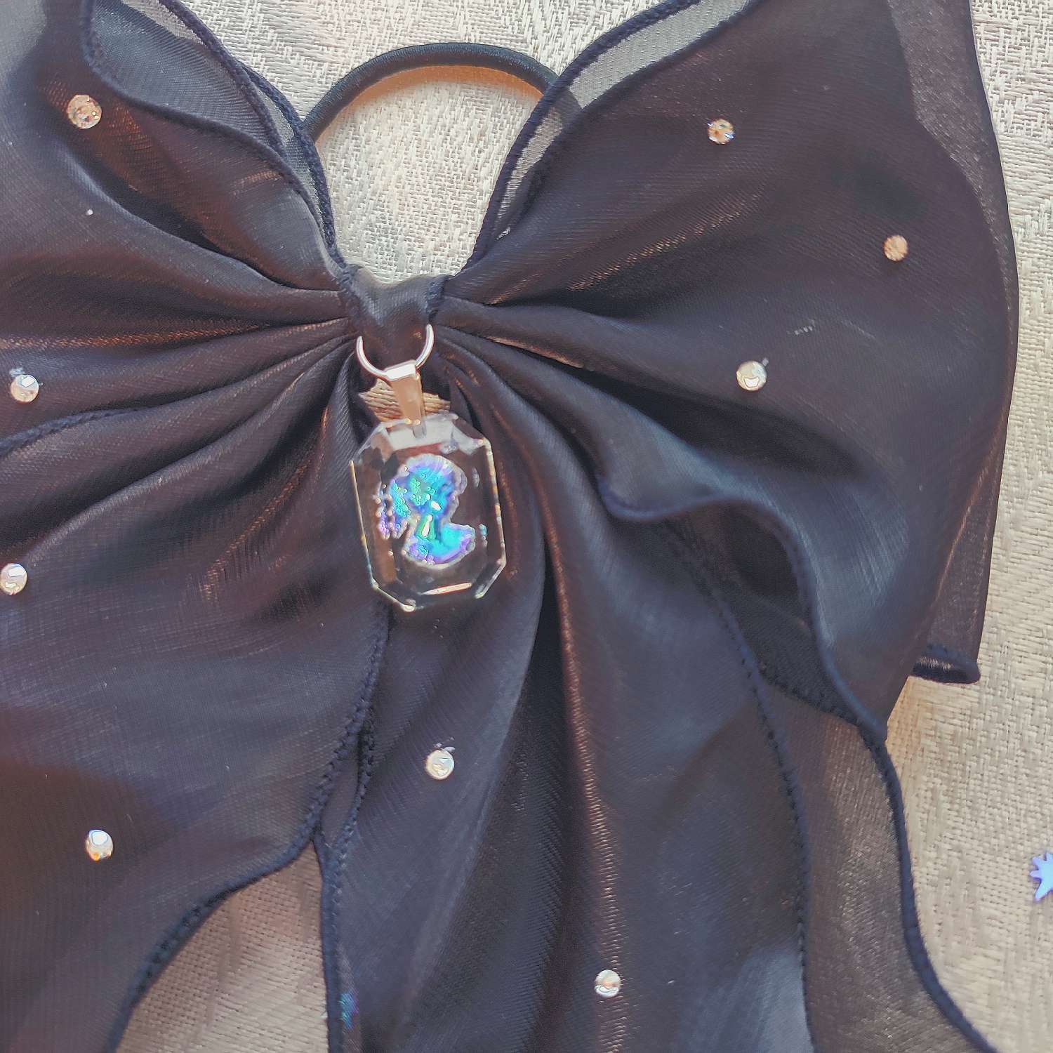 この黒のリボンに触れていると、夜空をそのまま結び上げたような感覚に包まれます。約17cm×26cmという大きさは、髪に添えた瞬間に視線を惹きつけ、存在感を放ちます。布地の上に散らしたスワロフスキーは星屑のように瞬き、わずかな光さえも受け止めて、夜空に散りばめられた星座を連想させます。