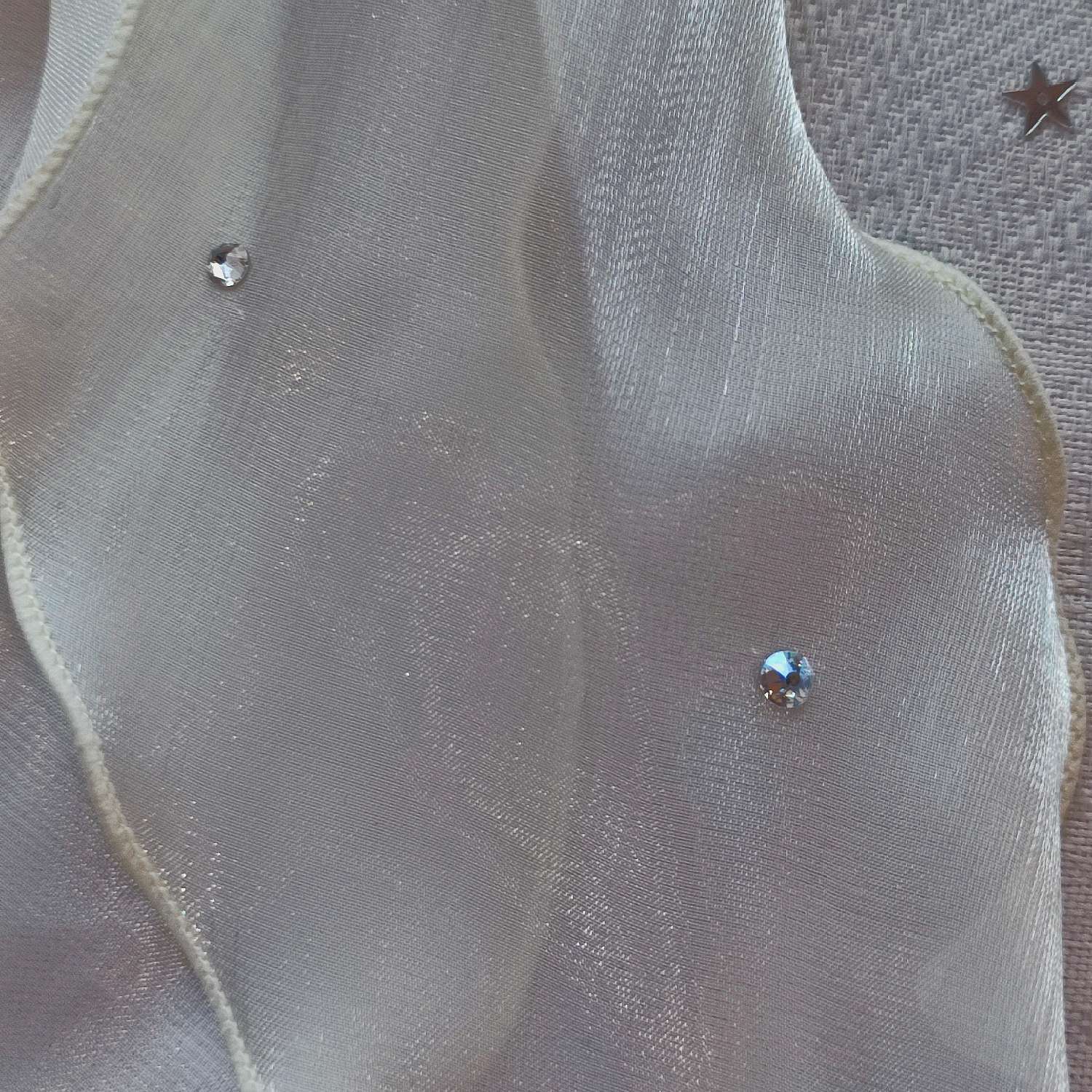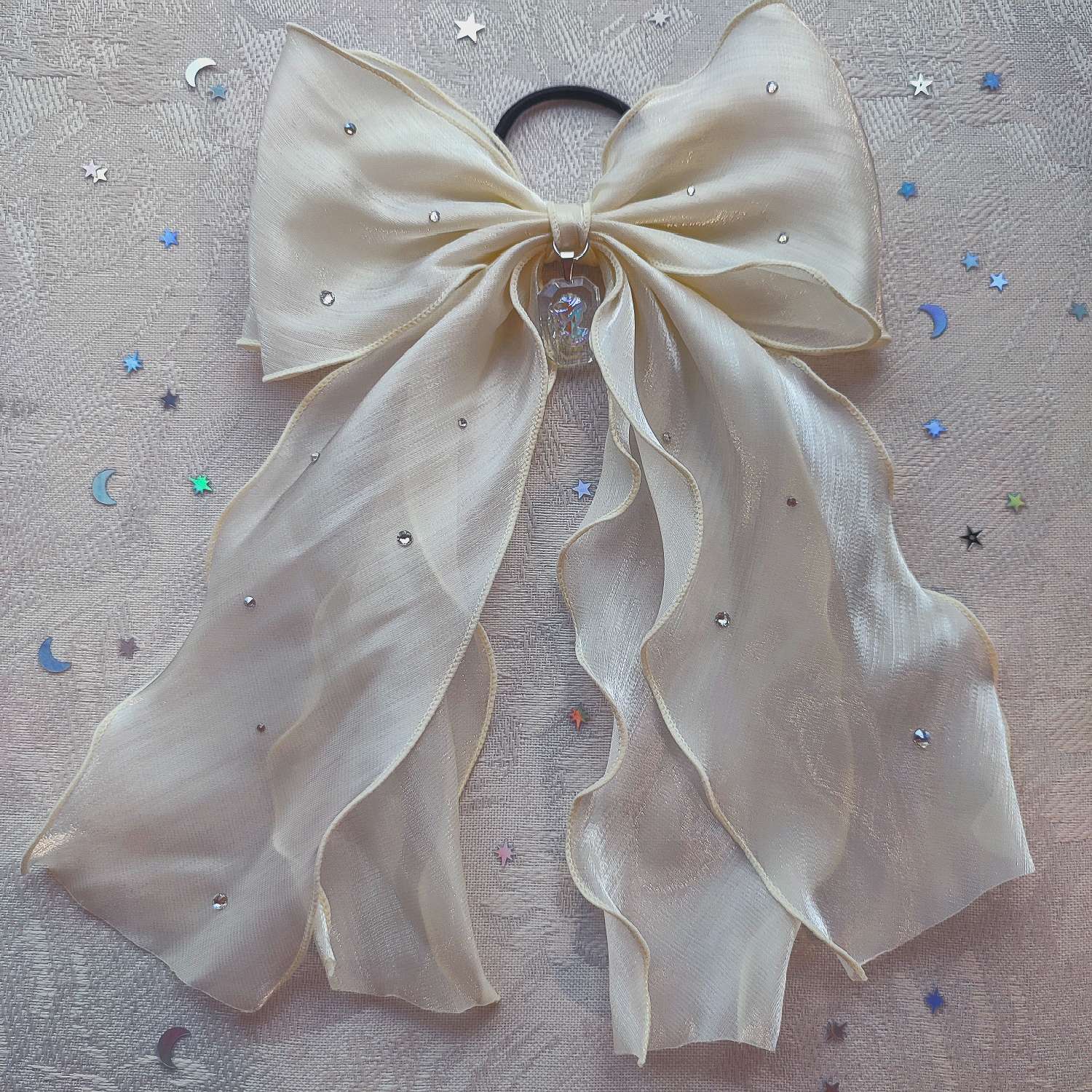 白のリボンを広げたとき、そこに透ける光は朝靄に包まれた風景のようで、柔らかく清らかな印象を与えてくれます。大きさはブラックと同じく約17cm×26cmですが、白という色が持つ軽やかさと透明感のおかげで、身に着けるとまるで純白のドレスを纏ったかのような気分になります。