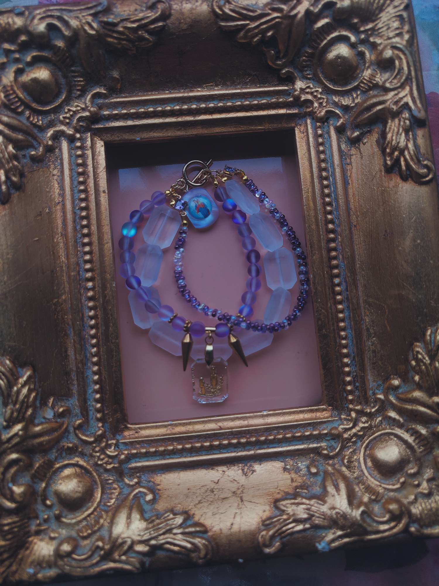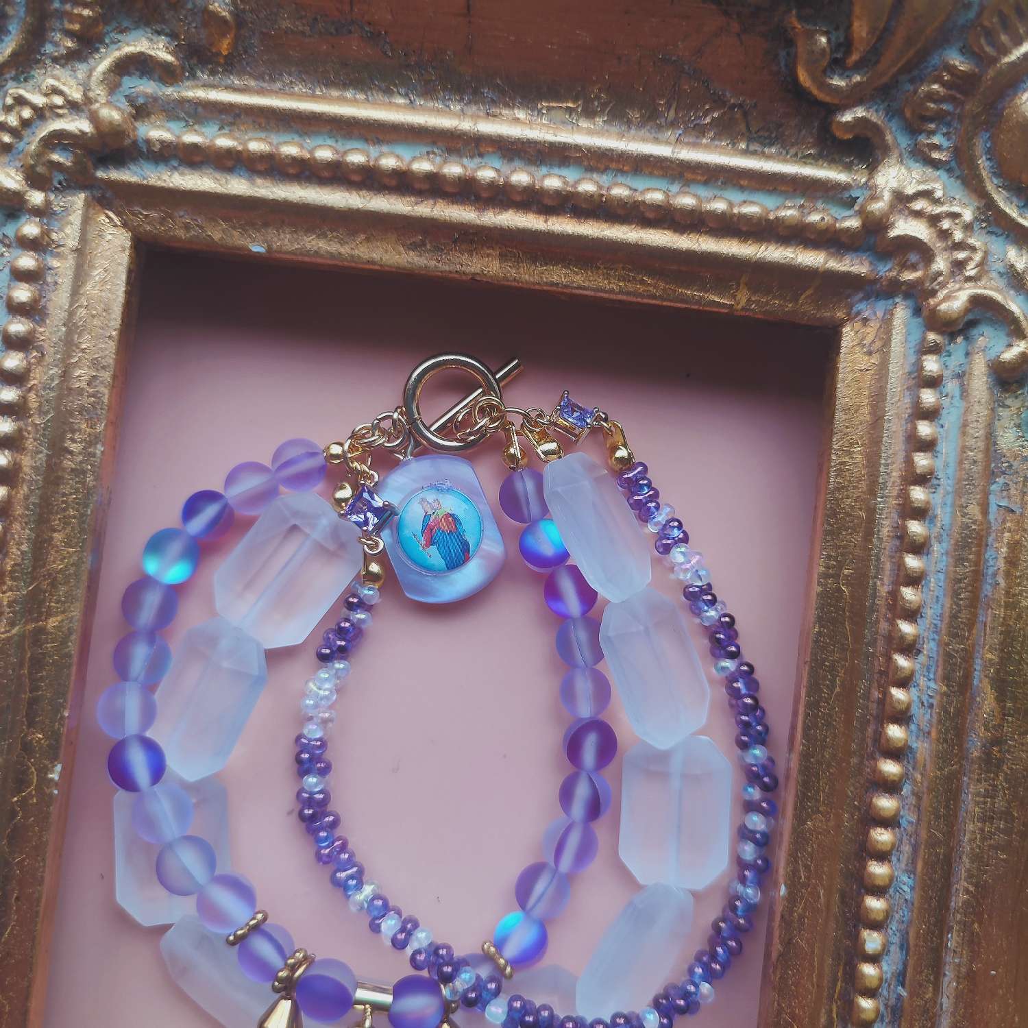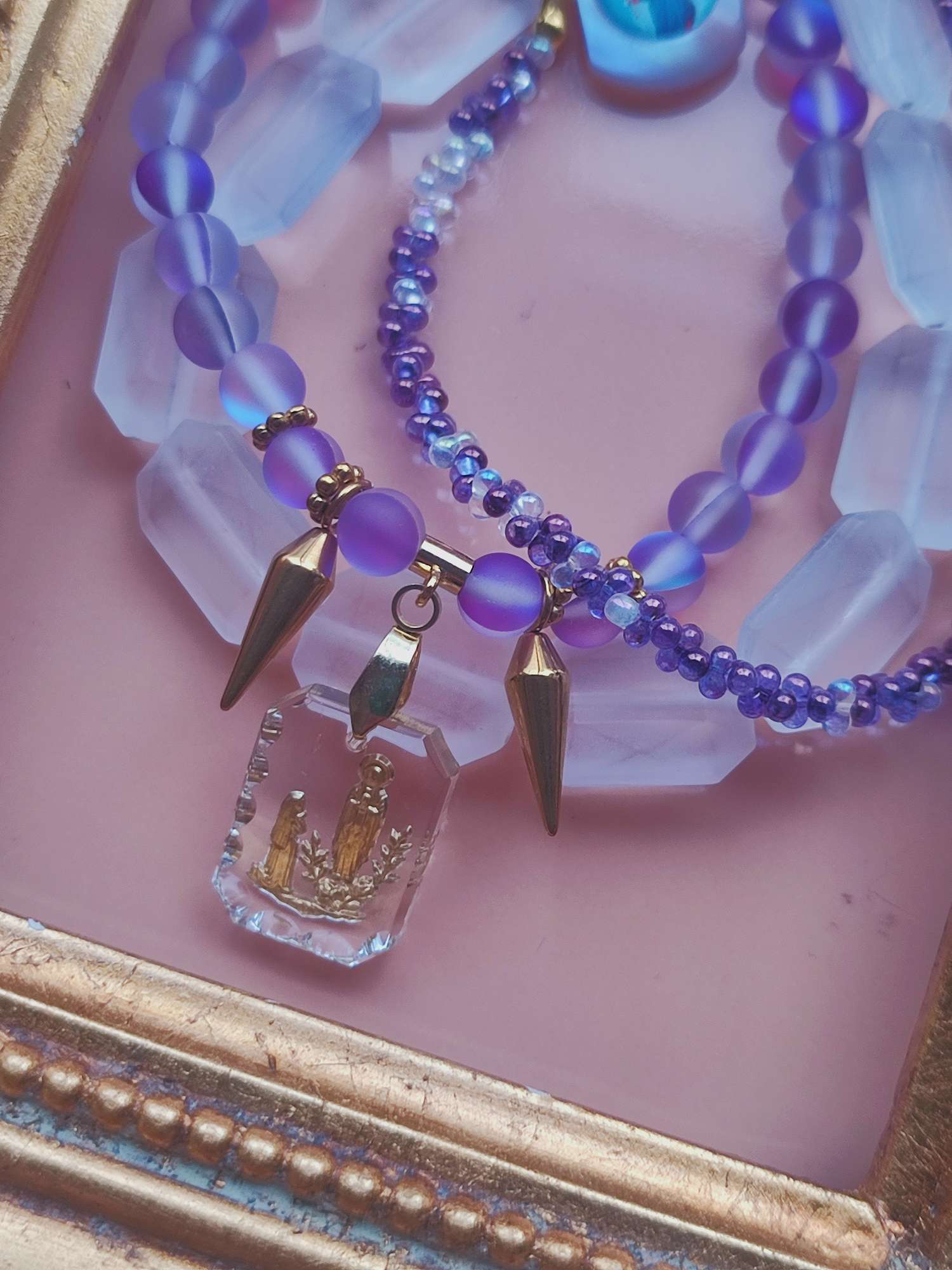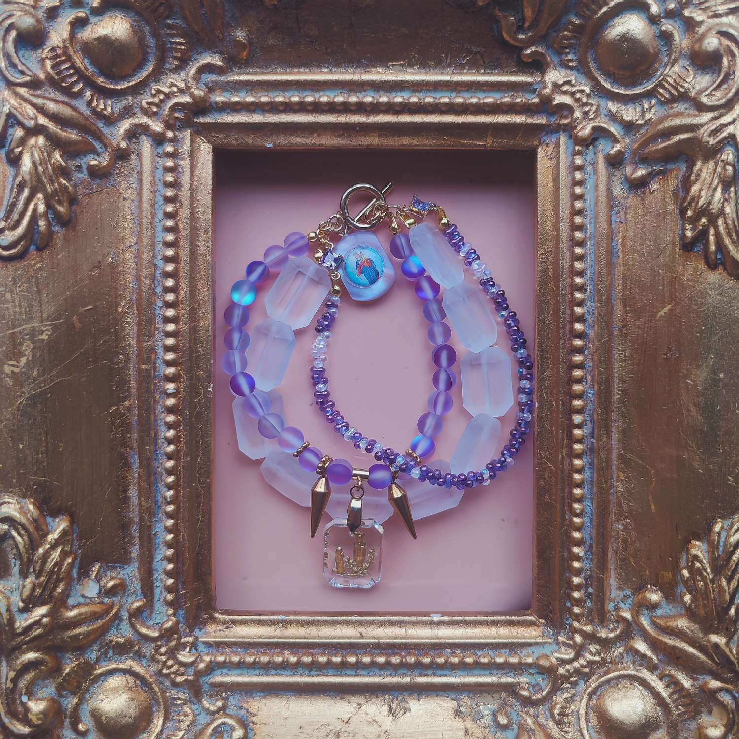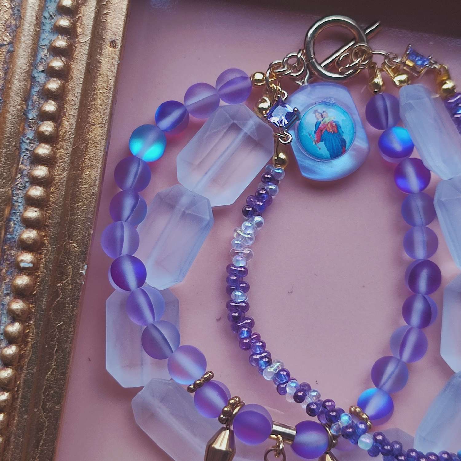 紫がかった光の粒をつなぎ合わせるたびに、小さな祈りを置くような感覚があります。今回仕立てたブレスレットの中心には、1960年代ドイツ製のインタリオメダイを組み込みました。モチーフとなっているのはルルドのマリア。19世紀に南仏のルルドで少女ベルナデッタの前に現れたとされる奇跡の物語は、今も多くの巡礼者を惹きつけ続けています。そのエピソードを、ガラス越しの金色の刻印に閉じ込めたかのようなパーツは貴重なアイテムです。