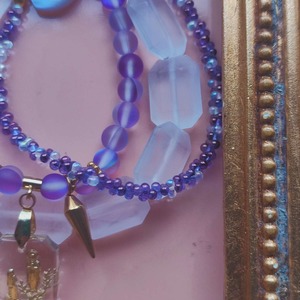 合わせたのはパープルのルナフラッシュガラスとチェコガラス、そしてフランス製のルーサイト。ルナフラッシュはその名の通り月光を思わせる幻想的な輝きを宿し、角度によって青から紫へと揺らぎます。チェコガラスはボヘミアの伝統工芸として19世紀からヨーロッパを席巻したもの、そしてルーサイトは1930年代にアメリカで開発されたアクリル樹脂で、戦後のフランスではアクセサリー素材として多用され、時代のモダンさを象徴しました。歴史ある素材同士を手に取って組み合わせると、過去の時代が静かに交差しているように思えてきます。