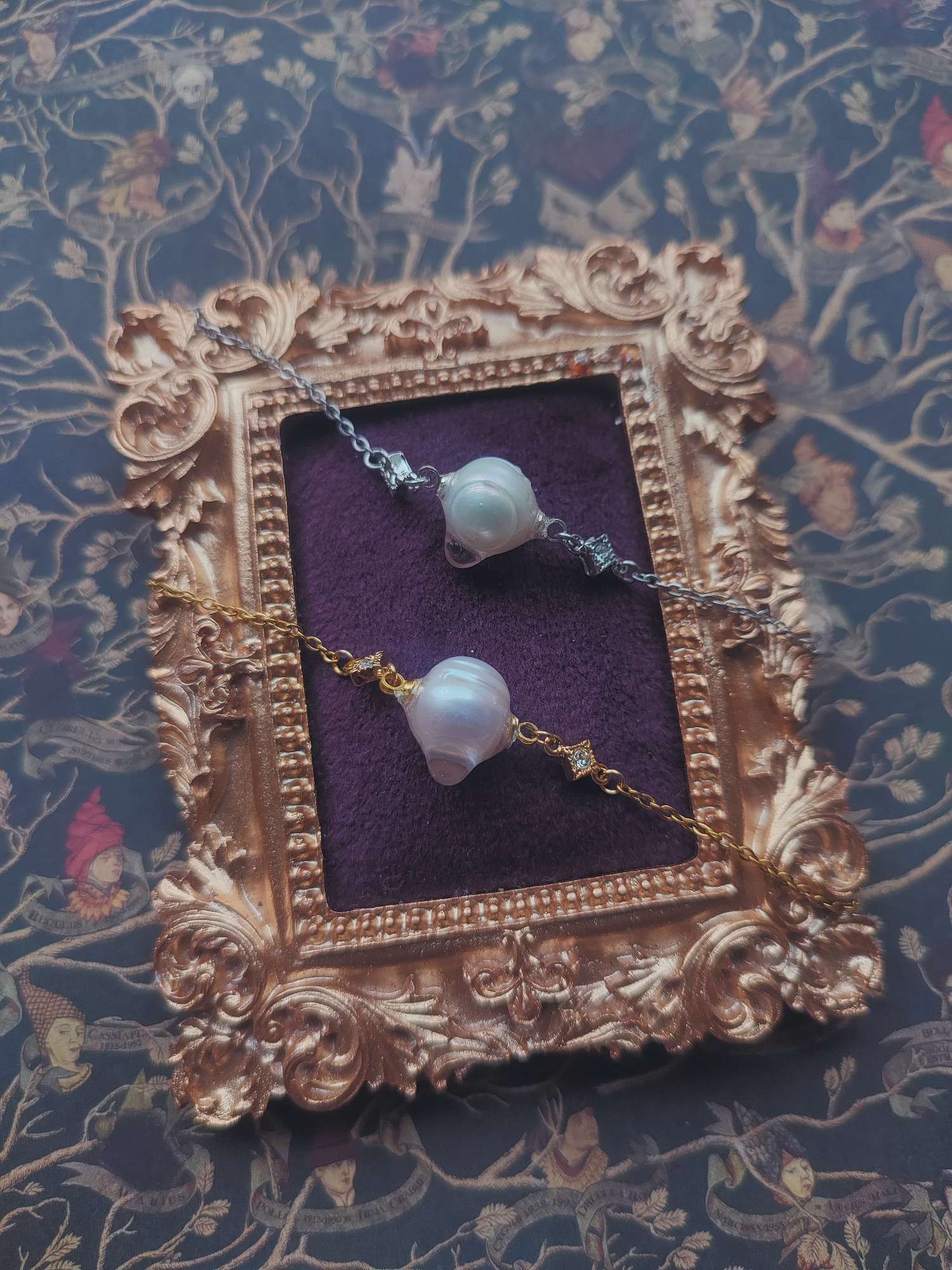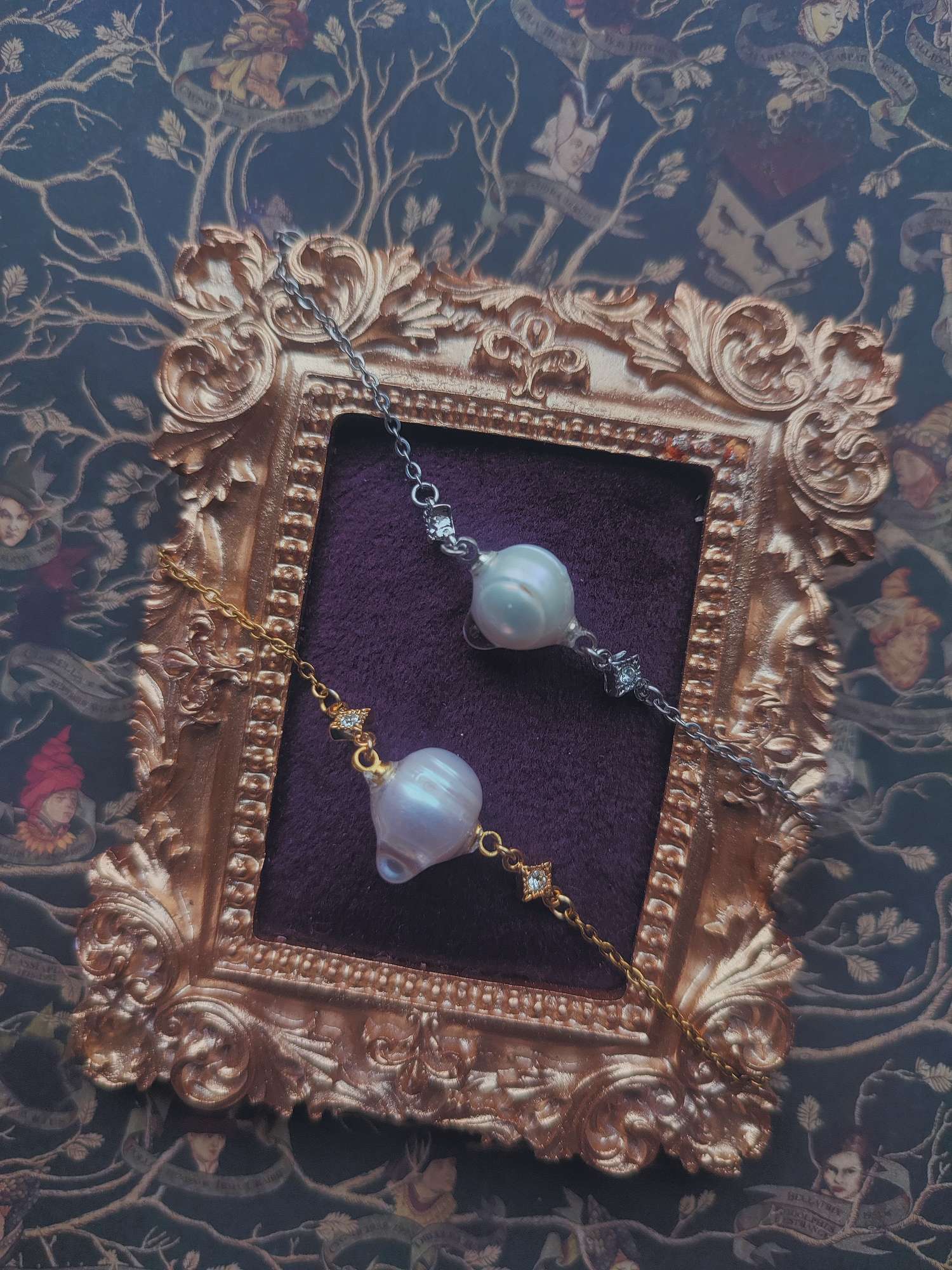 バロックパールは、16世紀のヨーロッパで特に愛された存在でした。規則的で丸い真珠よりも、自然が偶然に生んだいびつな形に神秘を見出し、聖堂の装飾や王侯貴族の宝飾品に多く使われた記録が残っています。特にスペインやポルトガルでは「自然が生んだ唯一無二の宝」として、宗教的なモチーフや人物像の一部に組み込まれていました。その自由な造形の美は、今も変わらず強い魅力を放っています。