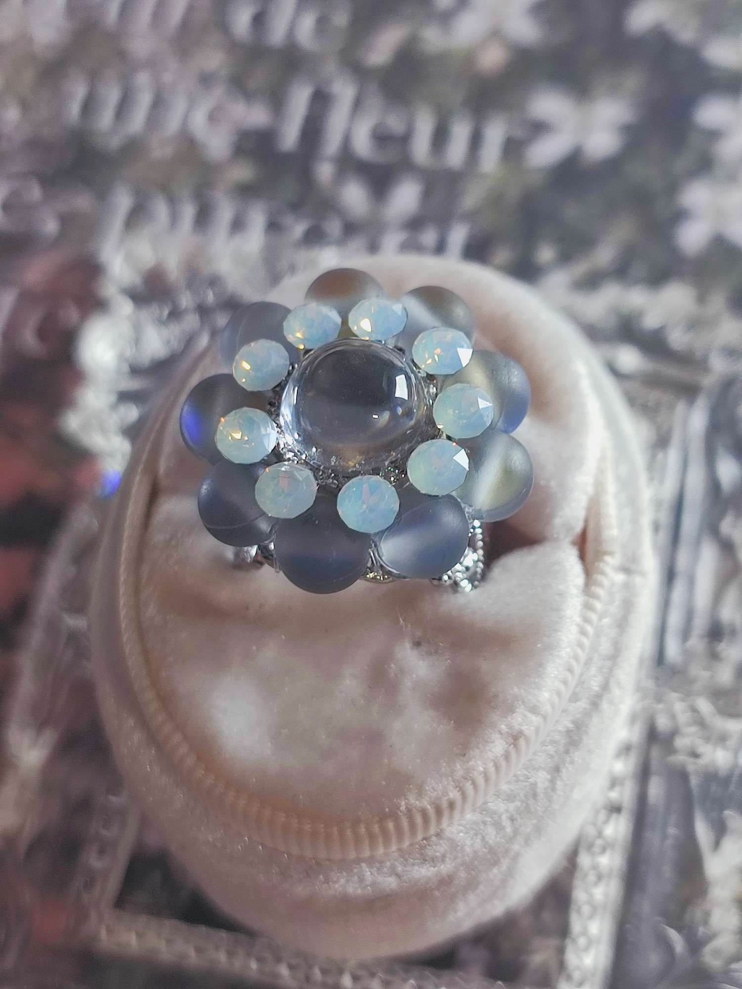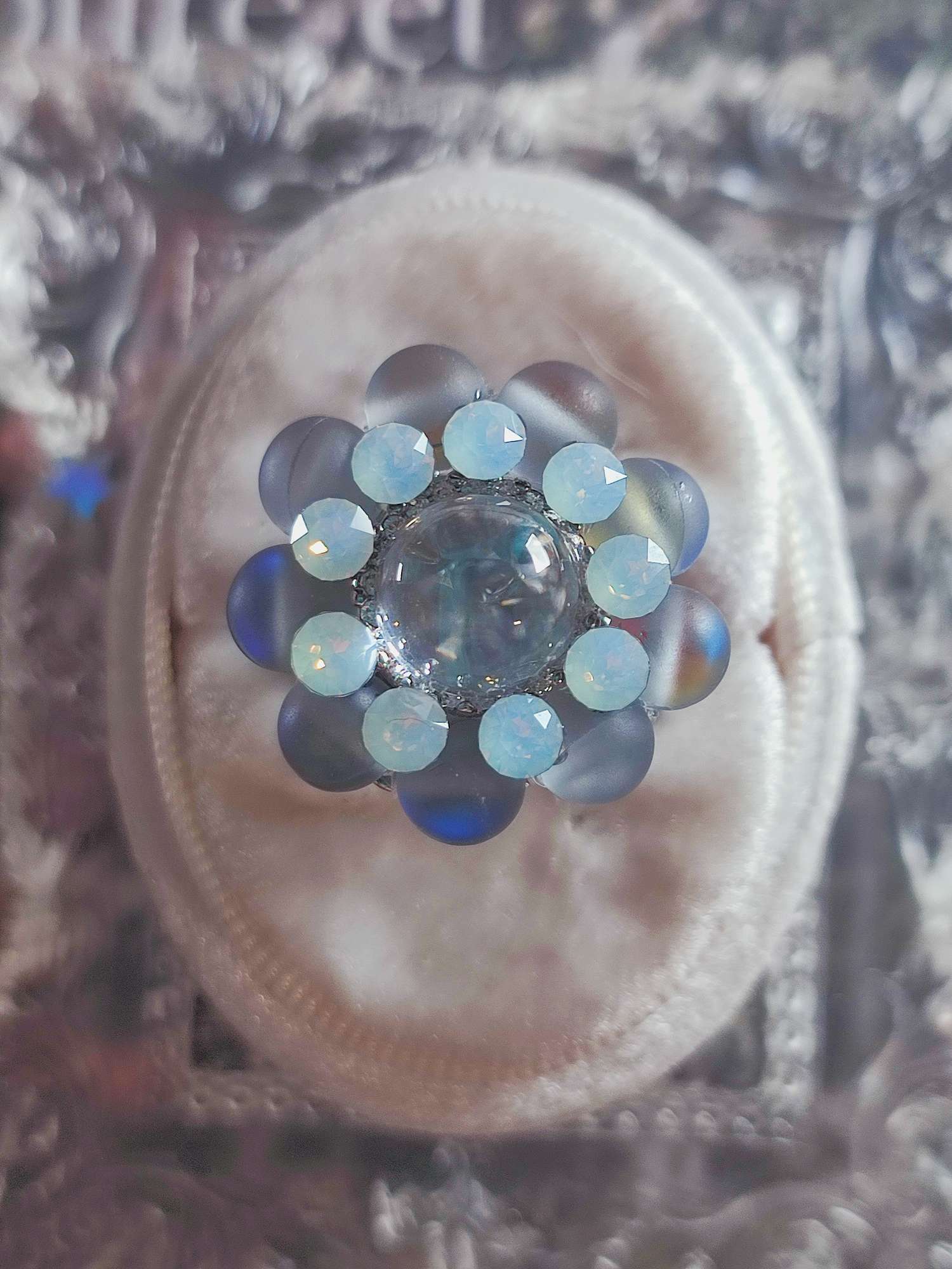 このリングは、外から見ればひとつの花のようですが、その中心には動く光があります。固定された輝きではなく、生きている光。アンティークガラスがそれを受け取り、拡げ、そしてまた閉じ込める。その繰り返しの中に、古い工芸と新しい素材が共鳴しています。