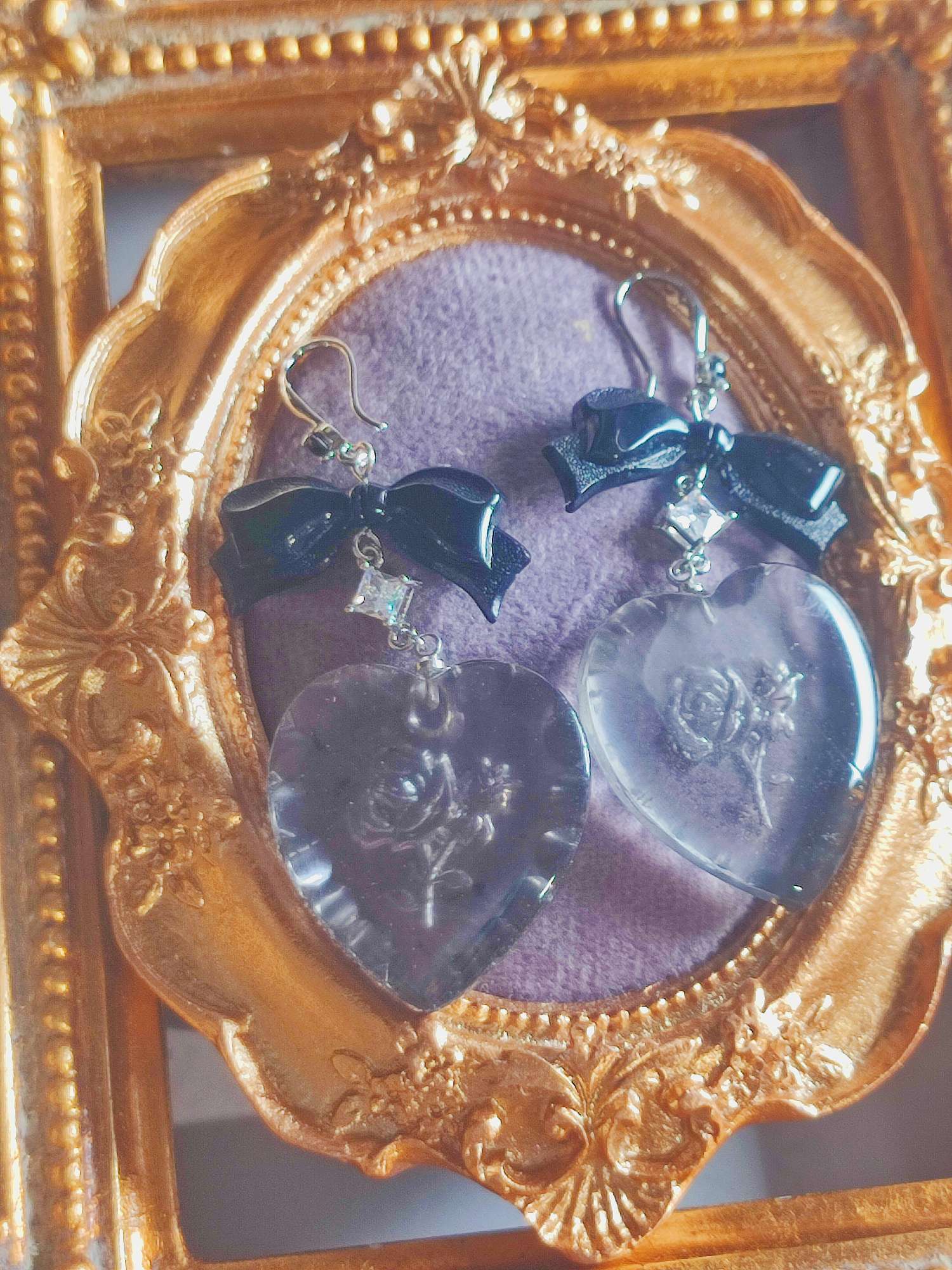 この耳飾りは、派手さではなく“余韻”のあるデザインを目指しました。アクリルの軽さと薔薇の深み、スワロフスキーの黒い光――それぞれが静かに溶け合いながら、まるで古い映画の一場面のような陰影を宿しています。