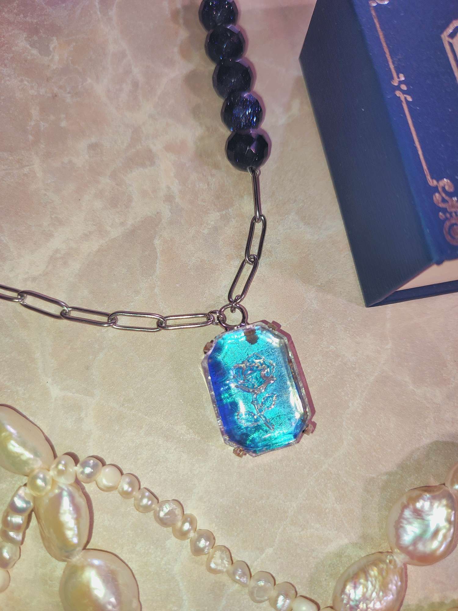 [素材]ドイツ製アクリル、モルフォ蝶、エナメル、アロイ、ステンレスチェーン、ブルーサンドストーン