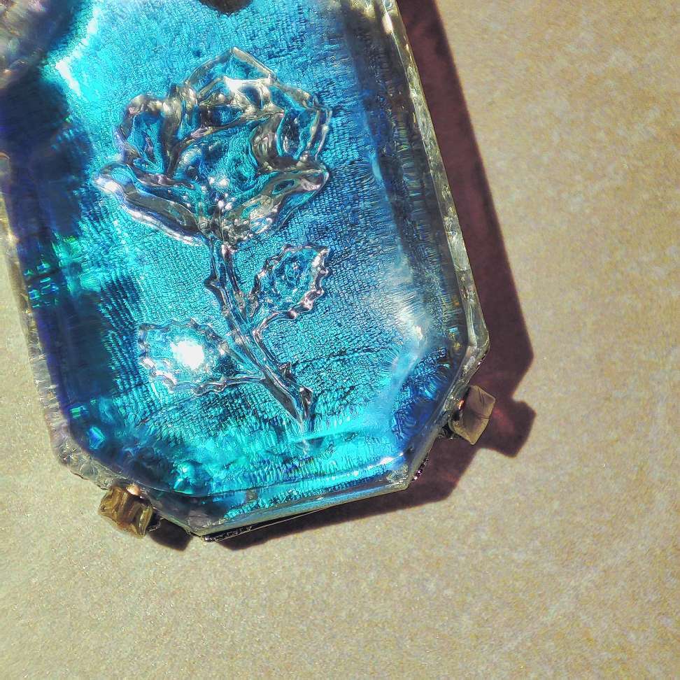 ローズインタリオはドイツの古い型をもとにしたデザインで、インタリオ技法自体は古代ローマの印章にまでさかのぼる歴史があります。透き通るベースに浮かぶ薔薇の線刻は、内側から照らされているように見え、モルフォの羽の青みと重なると特有の奥行きが生まれます。
