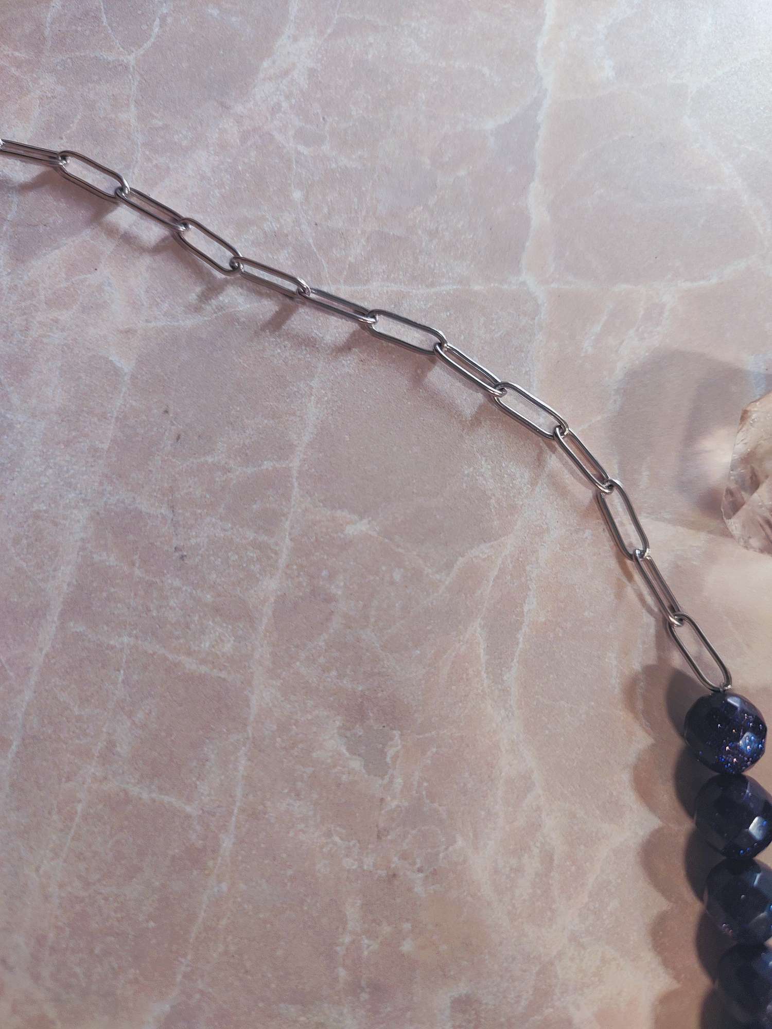 チェーン部分にはブルーサンドビーズを添えました。ブルーサンドは17世紀のヴェネツィアで偶然生まれたと言われる人工石で、銅の微粒子が光を反射し、静かなまま細かいきらめきを見せるのが特徴です。金属チェーンとつなぐことで、硬質な面と柔らかな発色の対比が生まれるように整えています。