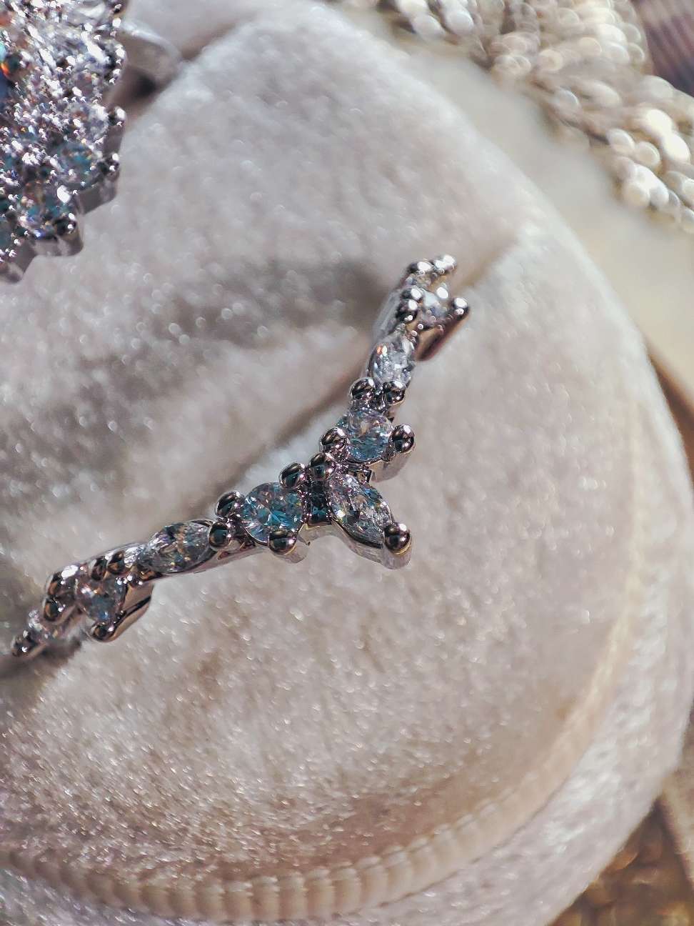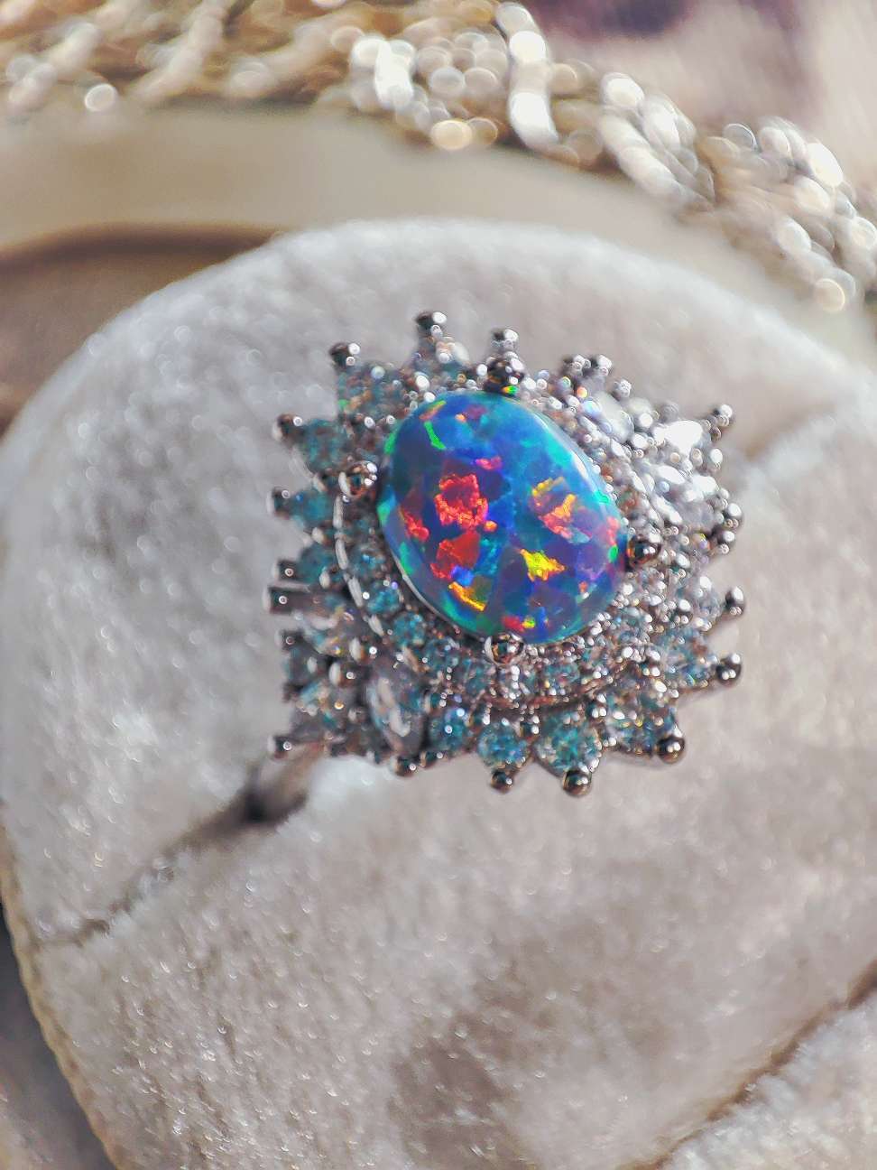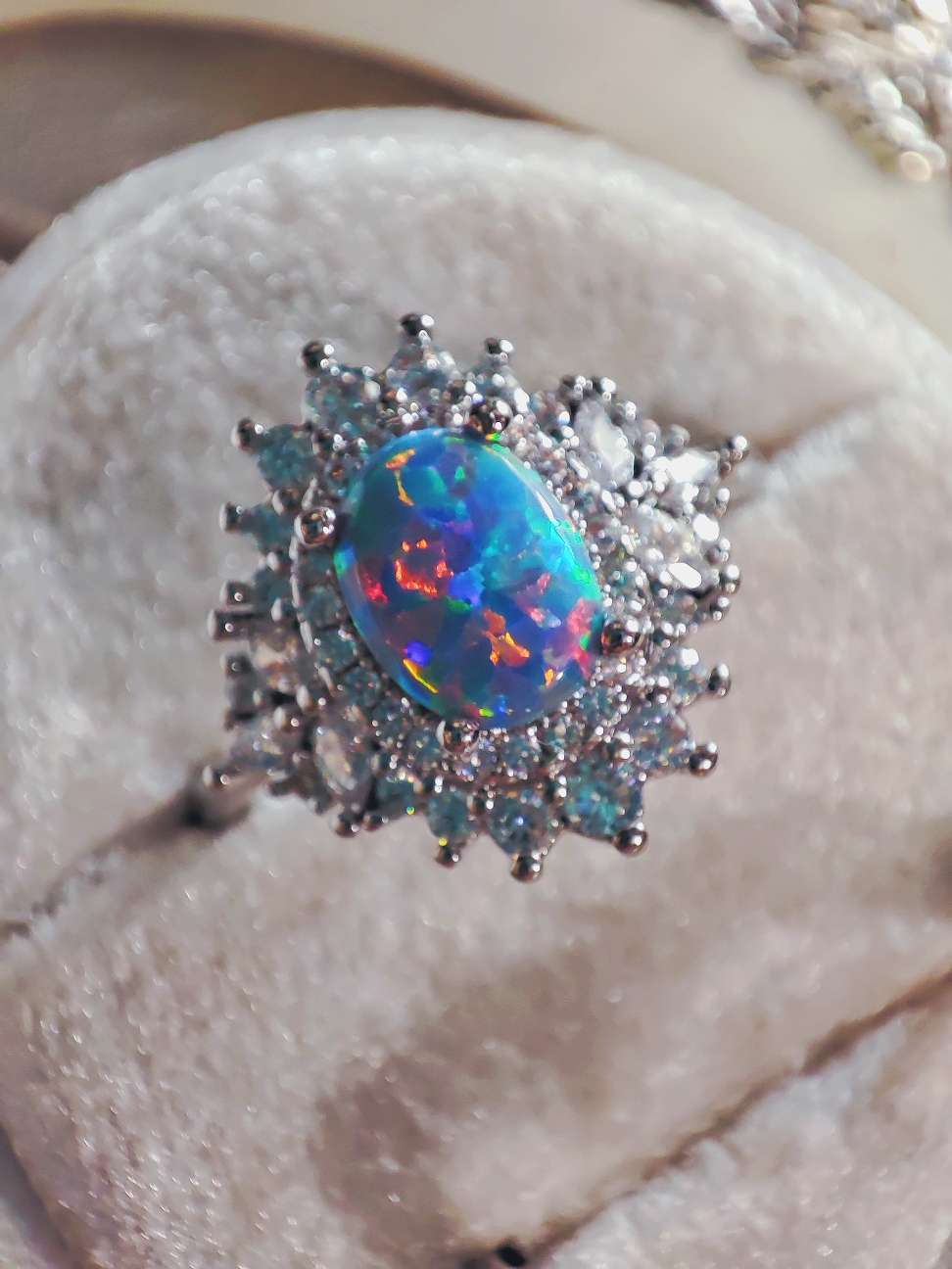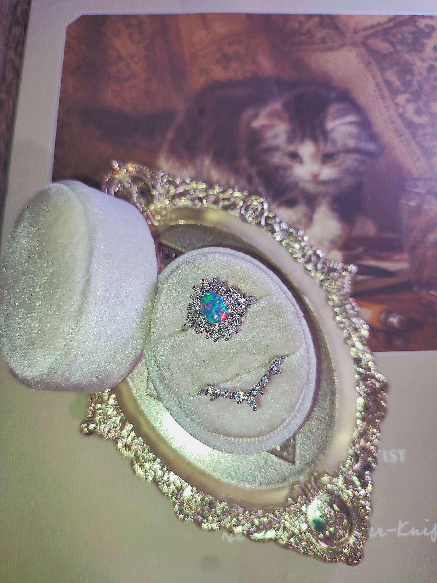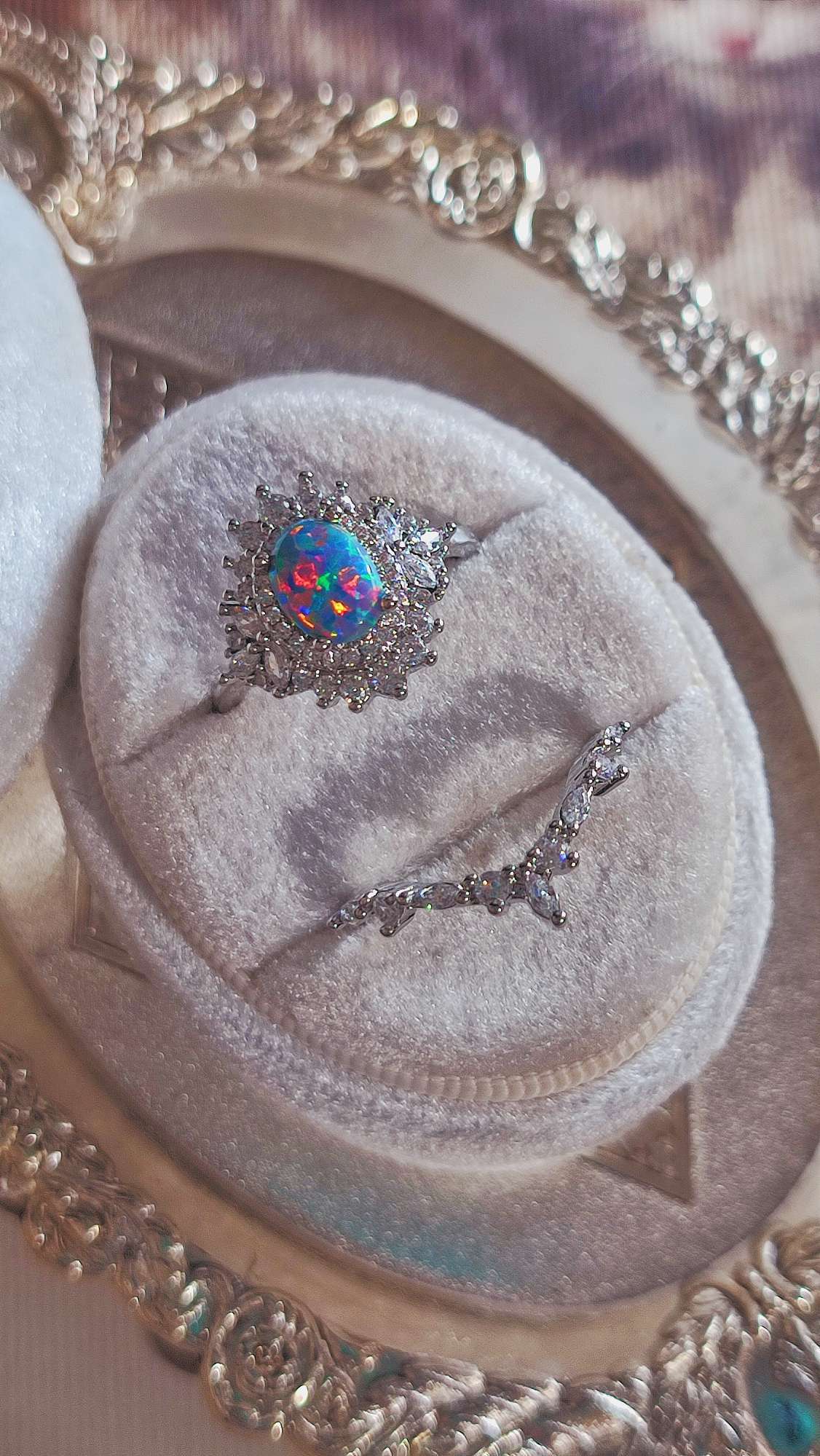 柔らかな光の下で眺めていると、京都オパール特有の多彩な色の揺らぎが静かに立ち上がってきました。今回はこの京都オパールを主役にした2本セットのリングをご用意しています。周囲にはキュービックジルコニアを丁寧にあしらい、全体の輝きが互いを引き立て合うように整えています。