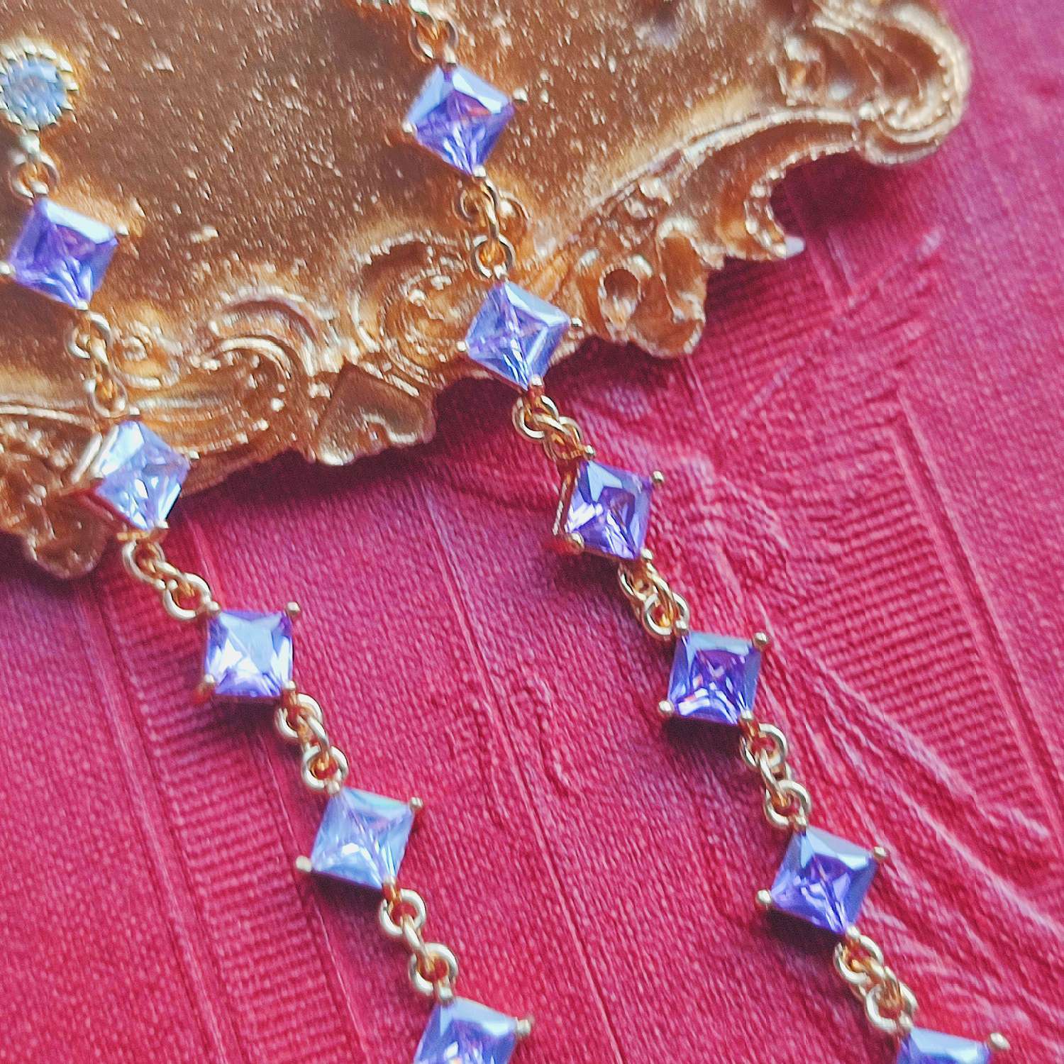 スクエアカットのジルコニアは光を拾いやすく、角度によって透明感や影の出方が変わります。チェーンに沿って連なる姿は、装飾写本に描かれる宝石の縁取りや、古いステンドグラスの小片を思わせるような雰囲気があります。仕上げには小さなスターのモチーフを添え、揺れの終わりにそっと輝きを残すようなアクセントにしました。