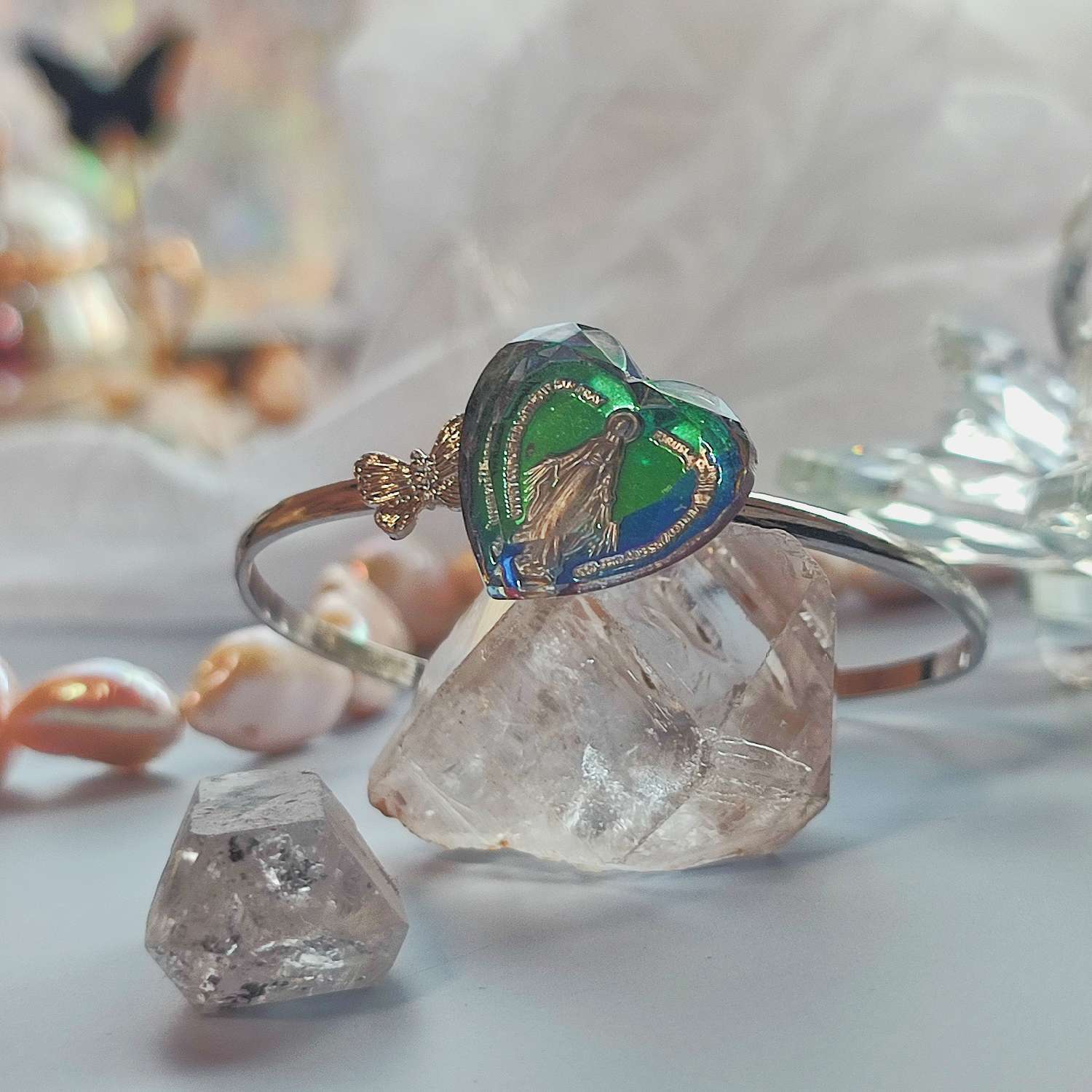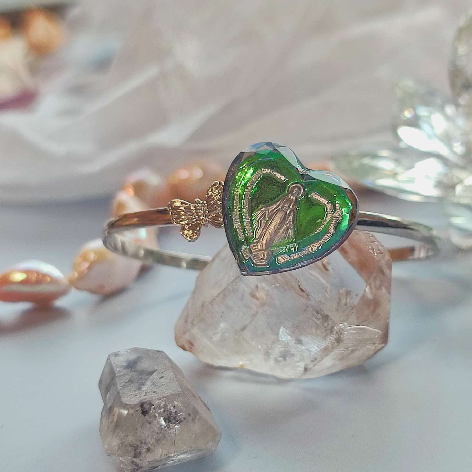 今回のインタリオはハートシェイプで仕立てられているため、光の反射が複雑に重なり、角度によってマリア像が柔らかく輝きます。バックにはアクリルのパールビーズを添え、アクセントとして小さなジルコニアチャームを配置しています。