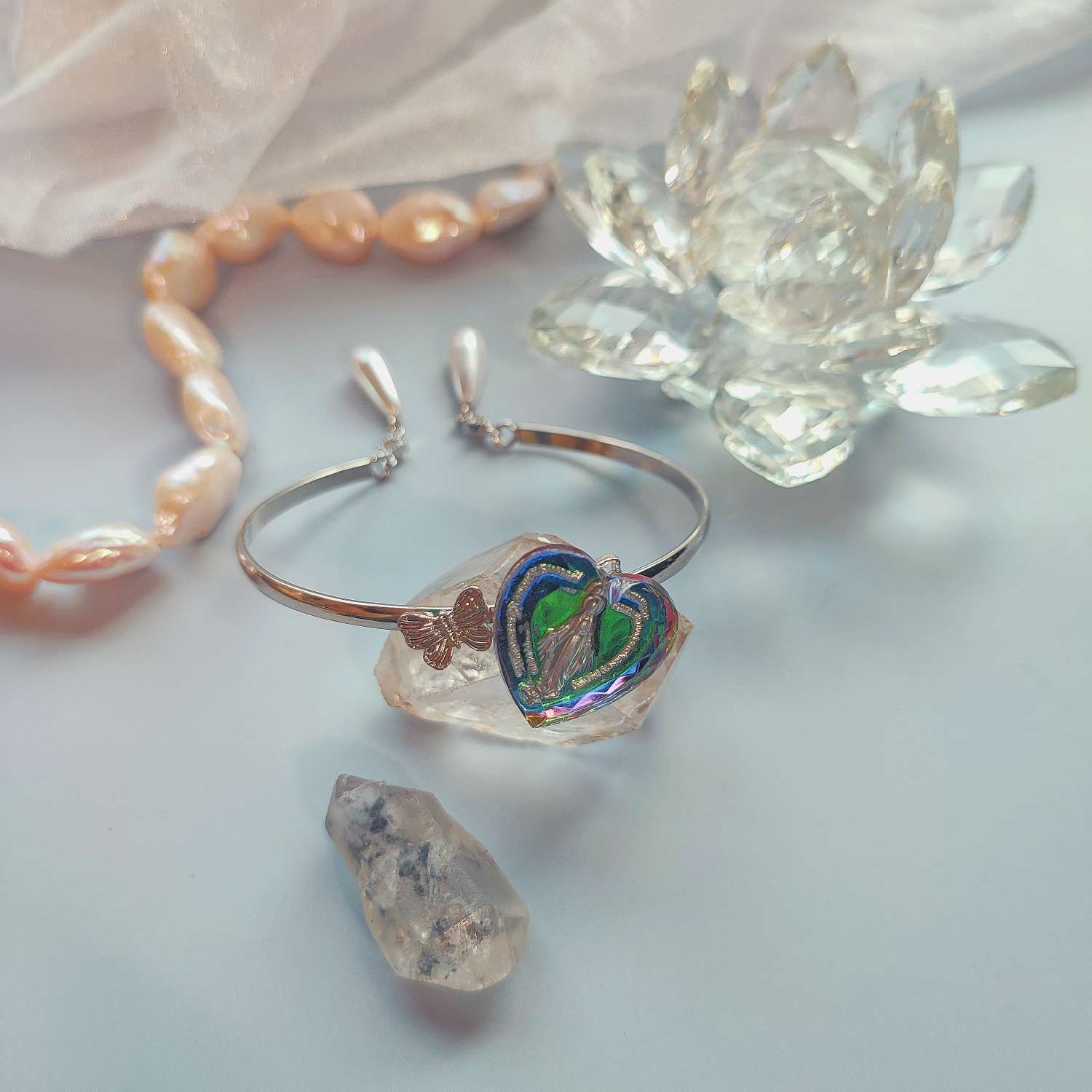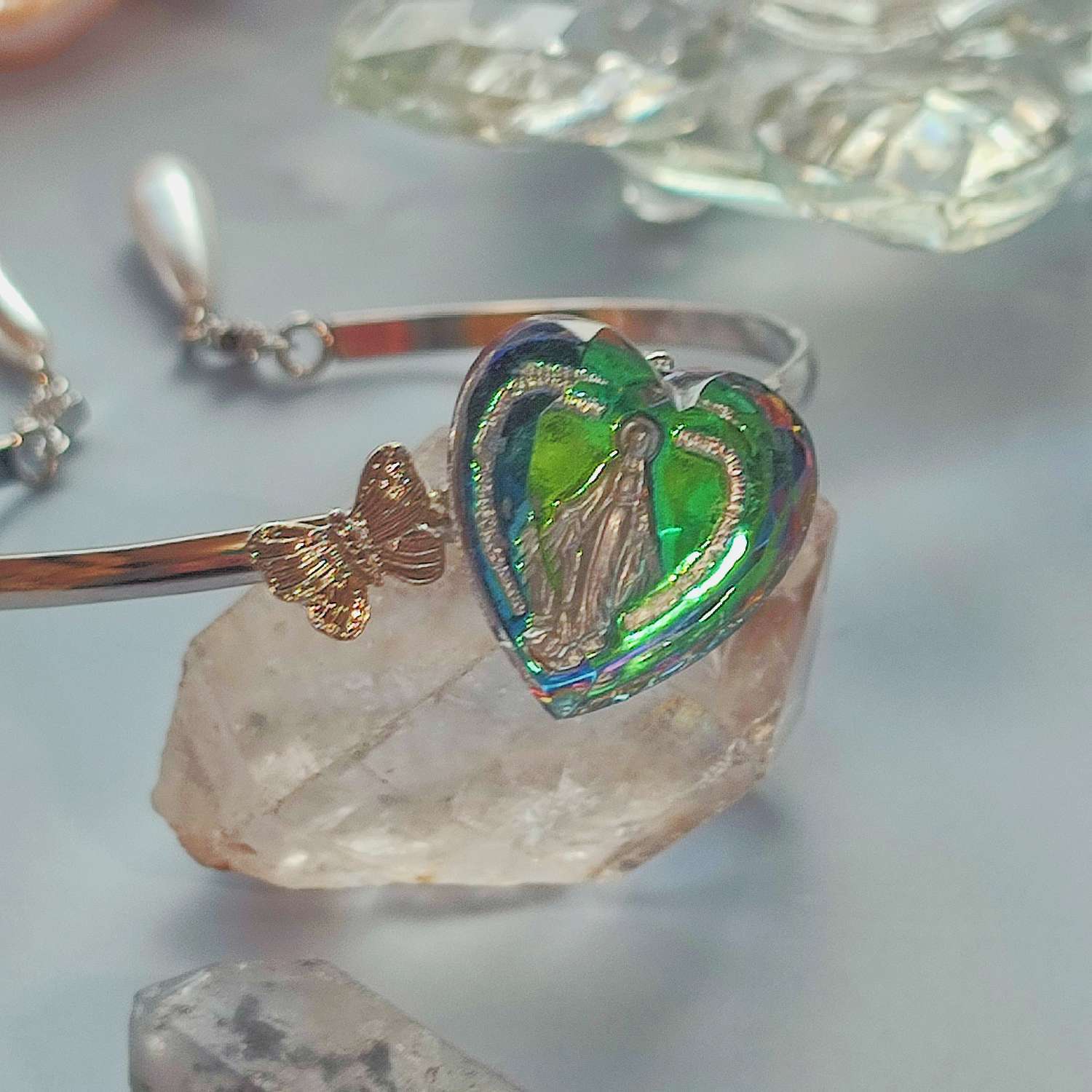 手元に光が差し込むと、インタリオの色彩が移ろい、刻まれた文字とマリア像が静かに姿を見せます。ヴィンテージガラスの魅力と現代の素材を組み合わせ、日常にも特別な日にも寄り添えるようにまとめた一点です。