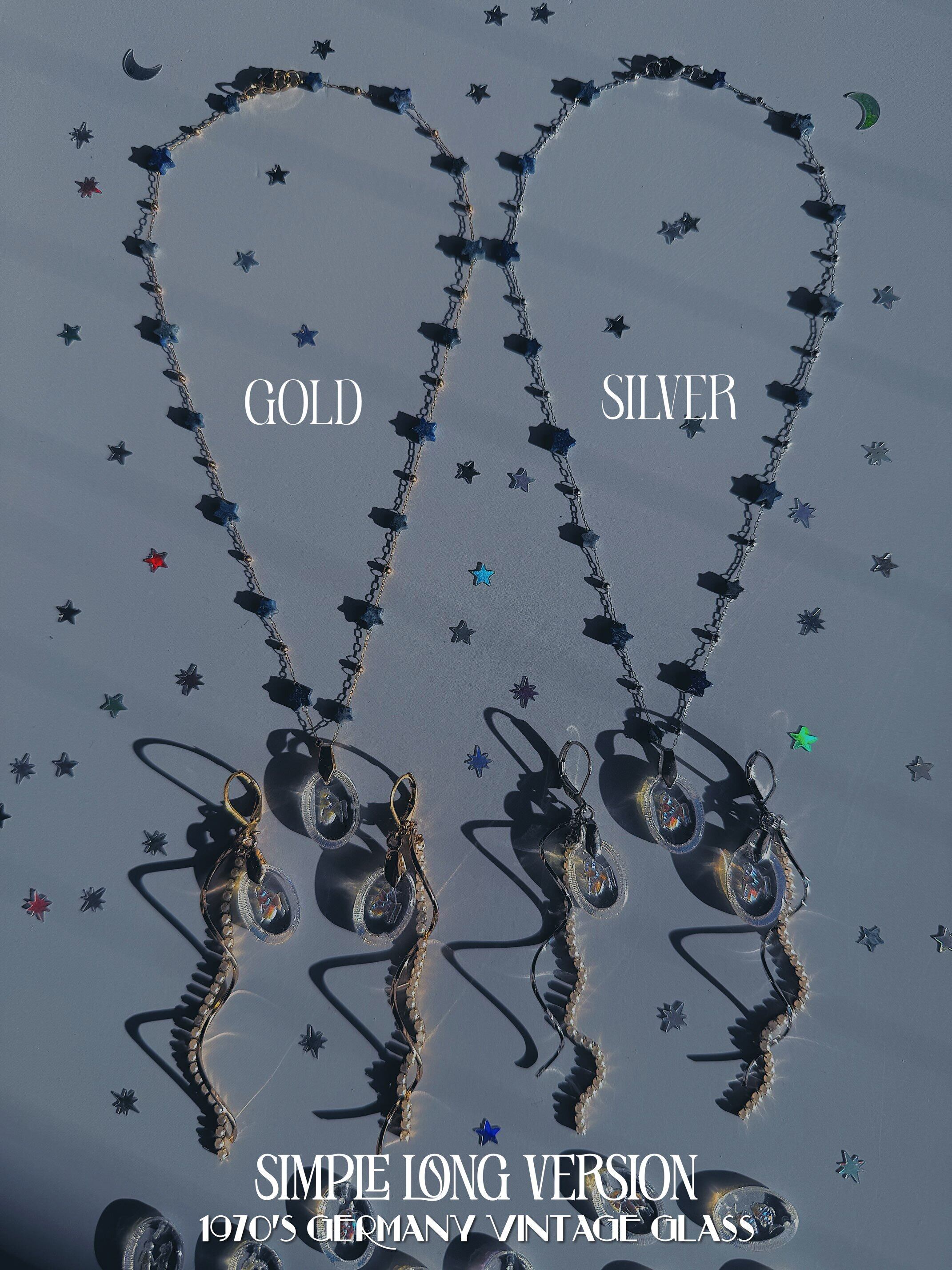 ロングタイプとショートタイプをご用意しており、こちらは、1970年代ドイツ製ヴィンテージガラスインタリオを中心に据え、冬のやわらかな光を大きく受け止めるように仕立てたロングタイプです。契約しているドイツの倉庫から届くこのインタリオは、約50年前に職人の手で作られた貴重な星座シリーズで、以前からリリースしており完売する人気のモチーフです。
