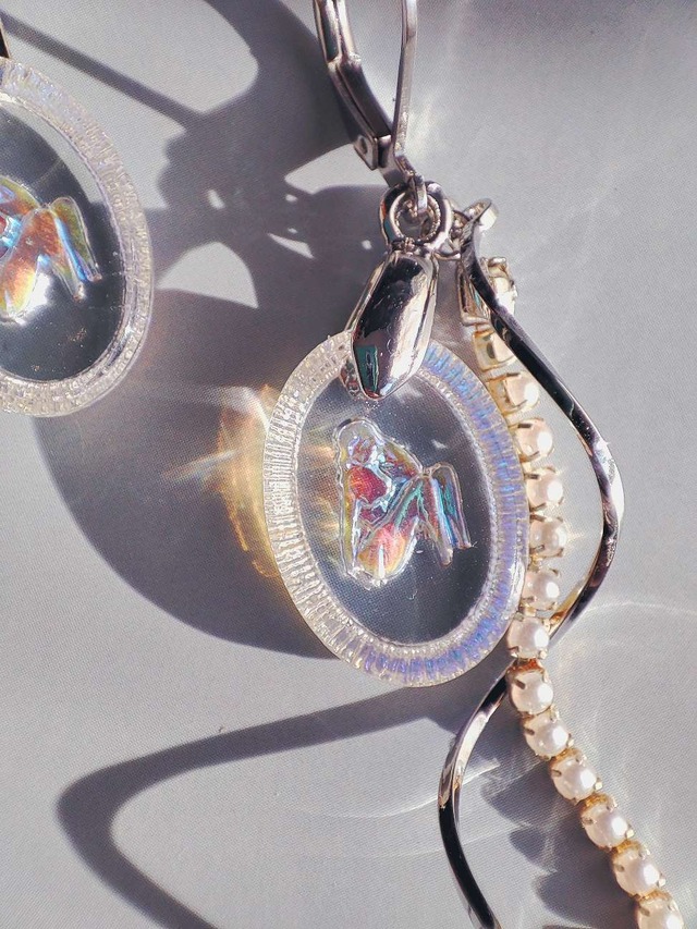 インタリオは古代ローマでも印章として用いられた技法で、裏面を彫り込むことで透過光が図柄を立体的に浮かび上がらせます。耳飾りがロングタイプはこの光の層がより大きく揺れ、冬の日差しの中で雪の反射のような透明感を見せてくれます。