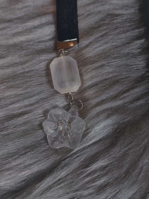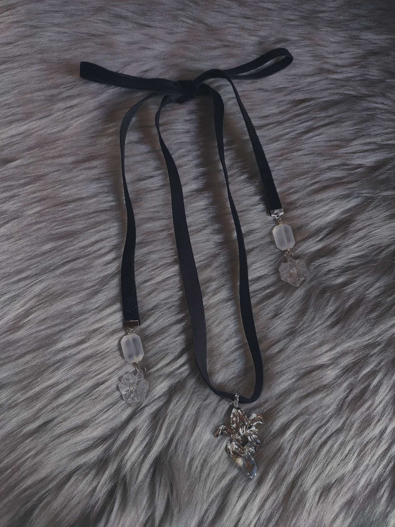 両端に揺れる透明の花パーツと磨りガラスのようなビーズも、素材の持つ静かな表情を活かしながら配置しています。長さのあるリボンに対し、モチーフが軽やかに揺れるよう構成しているため、結び方や巻き方を変えるだけで印象が一変するのも、このチョーカーの特徴です。