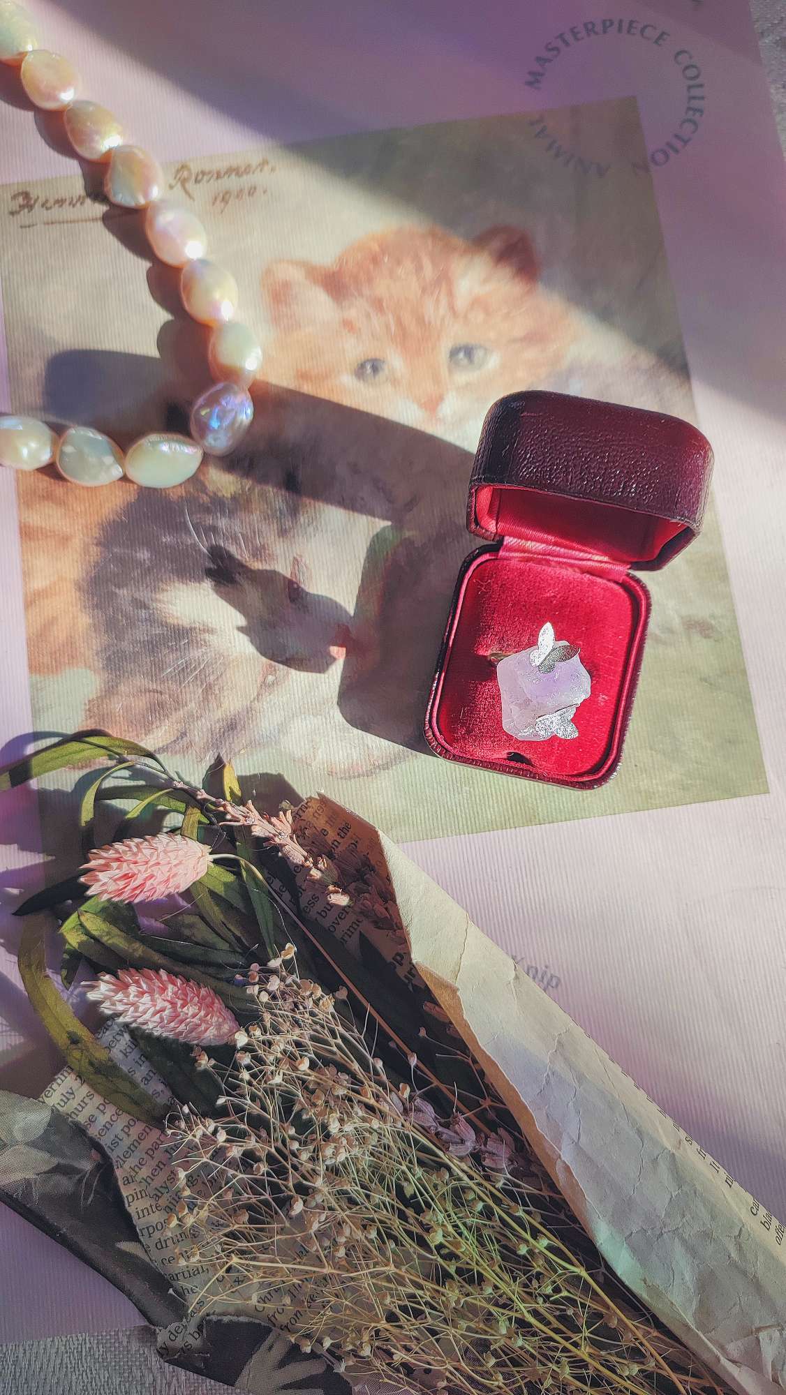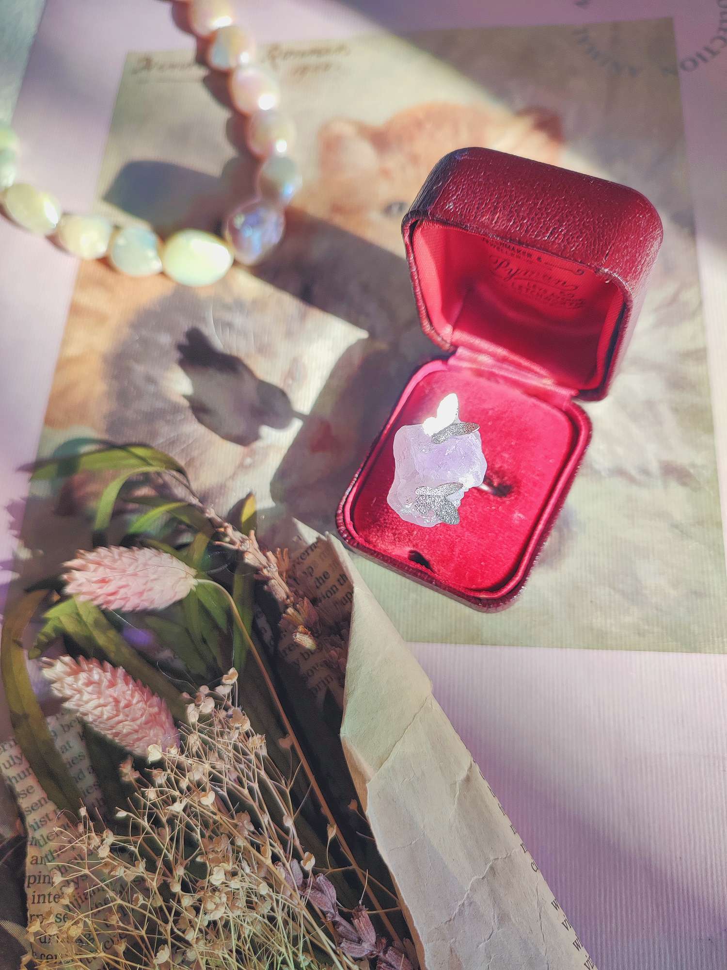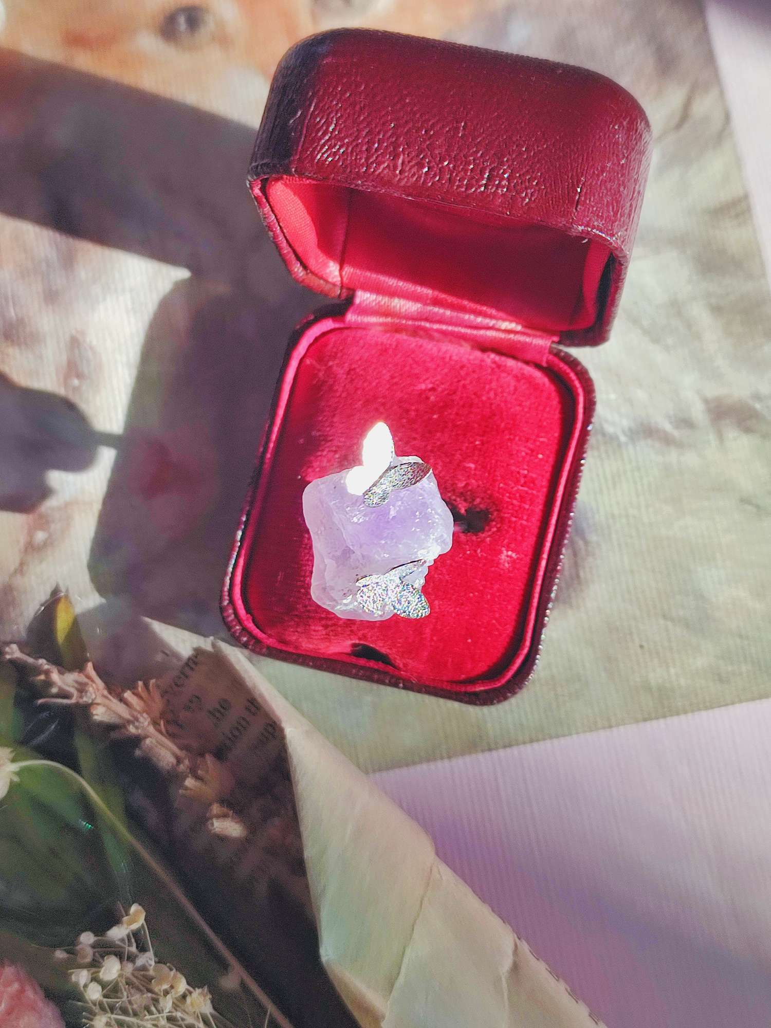 リングとして仕上げる工程では、原石の形を見極める時間が多く、自然のままのフォルムに蝶をどの位置で寄り添わせるかを丁寧に整えました。アメジストが持つ古い物語と、蝶が運ぶ象徴の軽さが一つのリングの中で静かに溶け合うように意図しています。