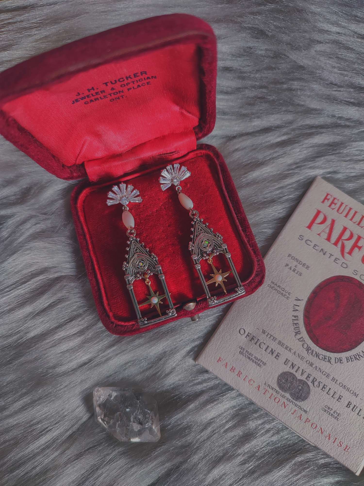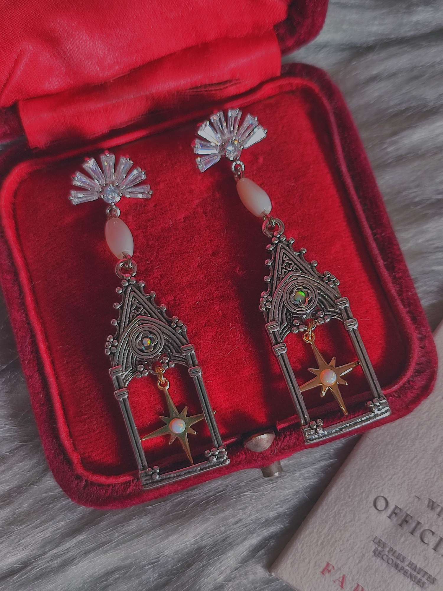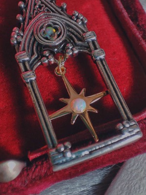 私のお店では、このように素材が持つ歴史や物語を手仕事の細部に少しずつ編み込むようにして形にしています。オパールの語り継がれた逸話や、マザーオブパールの古い風習、ゴシック建築に宿る象徴性を繋ぎ合わせながら、この耳飾りに静かな輝きを宿しています。
