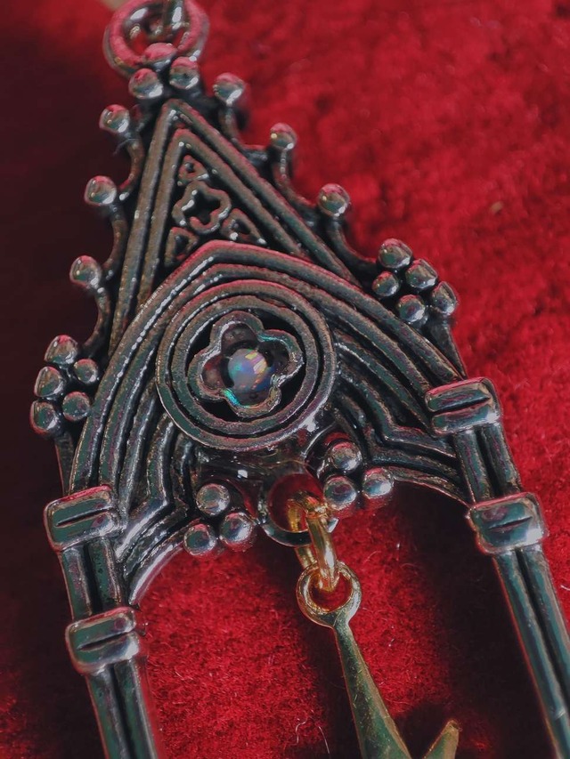 こちらは人工ですが歴史を辿ると、オパールは古代ローマで幸運のお守りとして珍重され、中世には聖堂の光を象徴すると語られていたこともあり、このモチーフとの相性は自然なものでした。ステンドグラスの小窓に見立てた部分には、小粒のオパールを埋め込みましたが、この光のにじみが建築の陰影に柔らかく馴染んでいくのを見るたびに、制作の手を進めながら時間がゆっくりと深まっていきました。