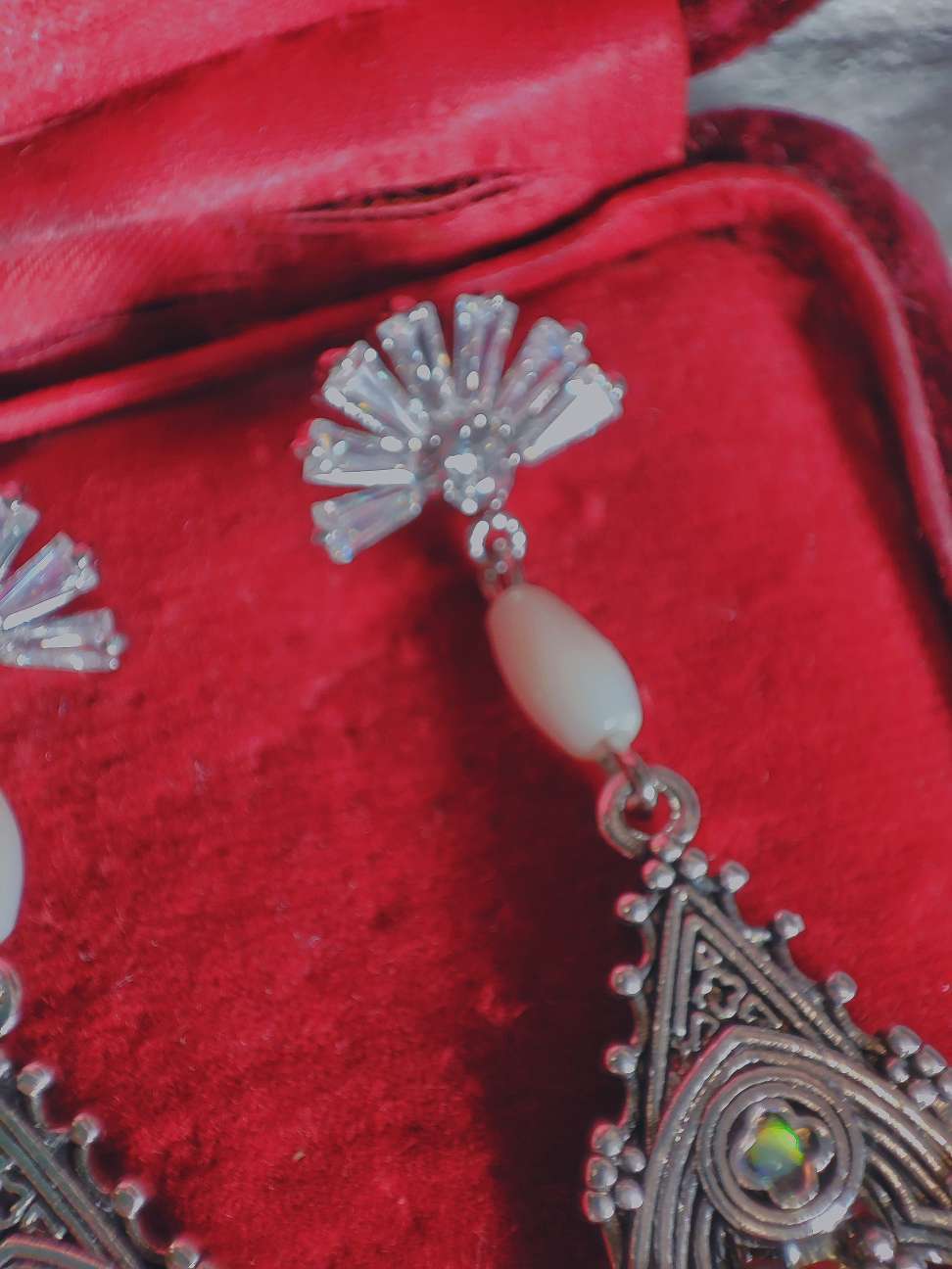 耳元で揺れるたび、小さな礼拝堂の窓に夜明けの光が差し込むように、色がふっと変わります。その移ろいを見るのが好きで、仕上げの工程を進めながら何度も角度を変えて確かめていました。どの角度でも違う光を返してくれるので、アクセサリーでありながら小さな装飾建築のようでもあります。