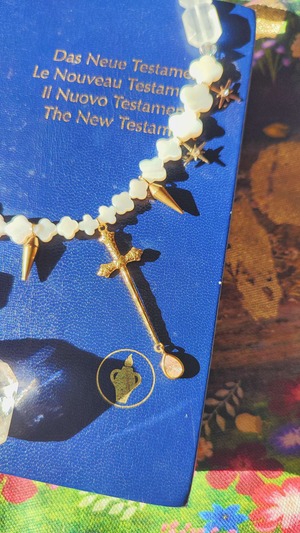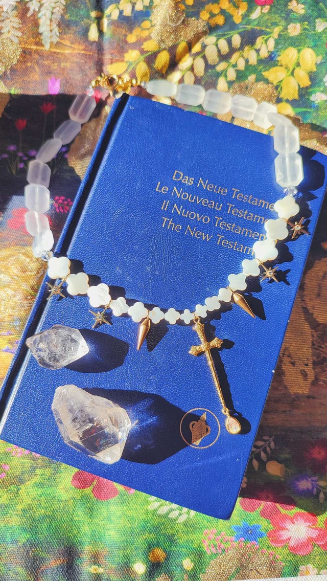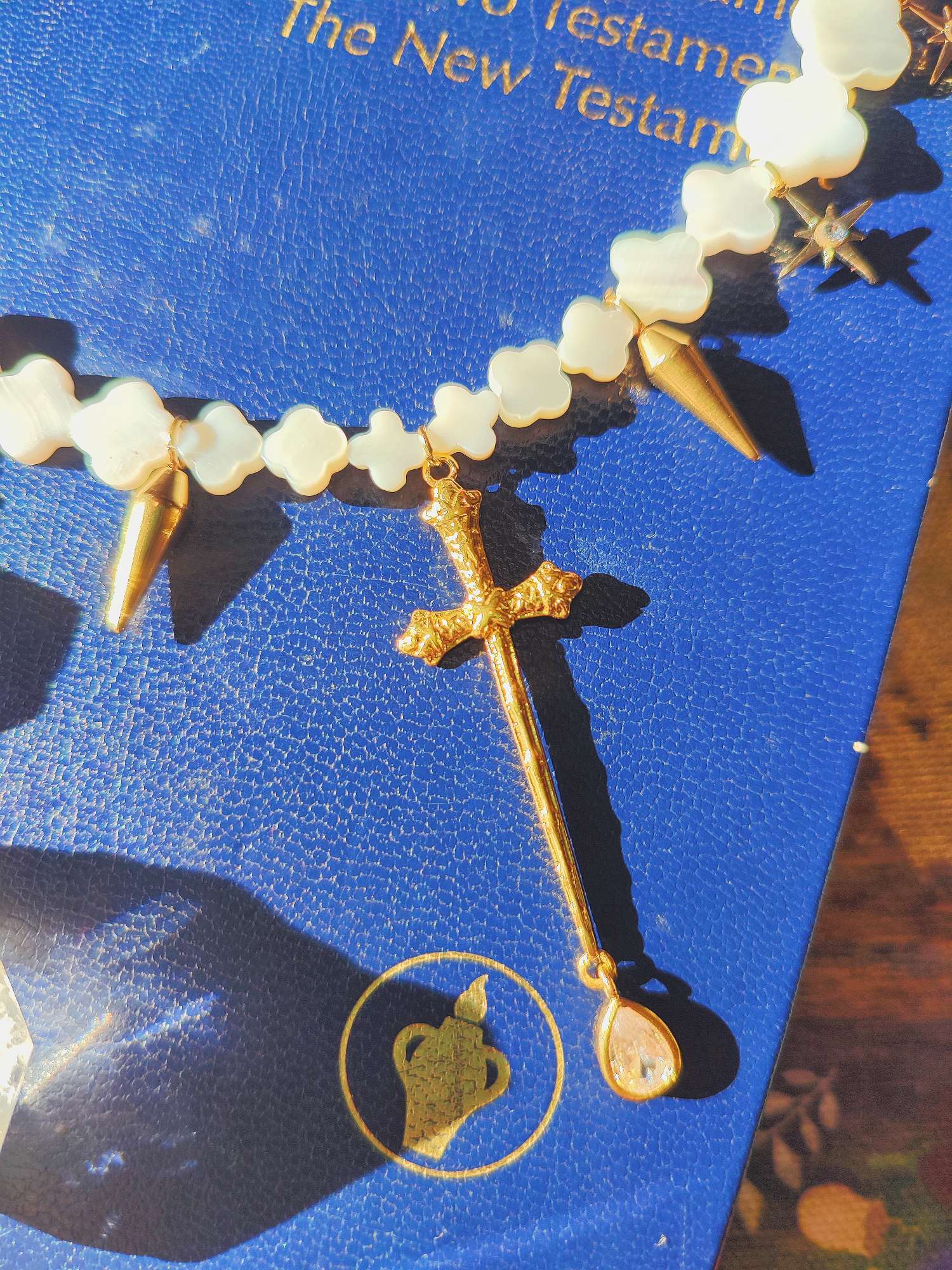 私のお店では素材の歴史や象徴を優しく組み合わせながら、身に着ける方の時間に寄り添うようなアクセサリーを形にしています。このネックレスもそのひとつとして、マザーオブパールの柔らかい光と、剣のモチーフが持つ古い象徴性を静かに結び合わせました。