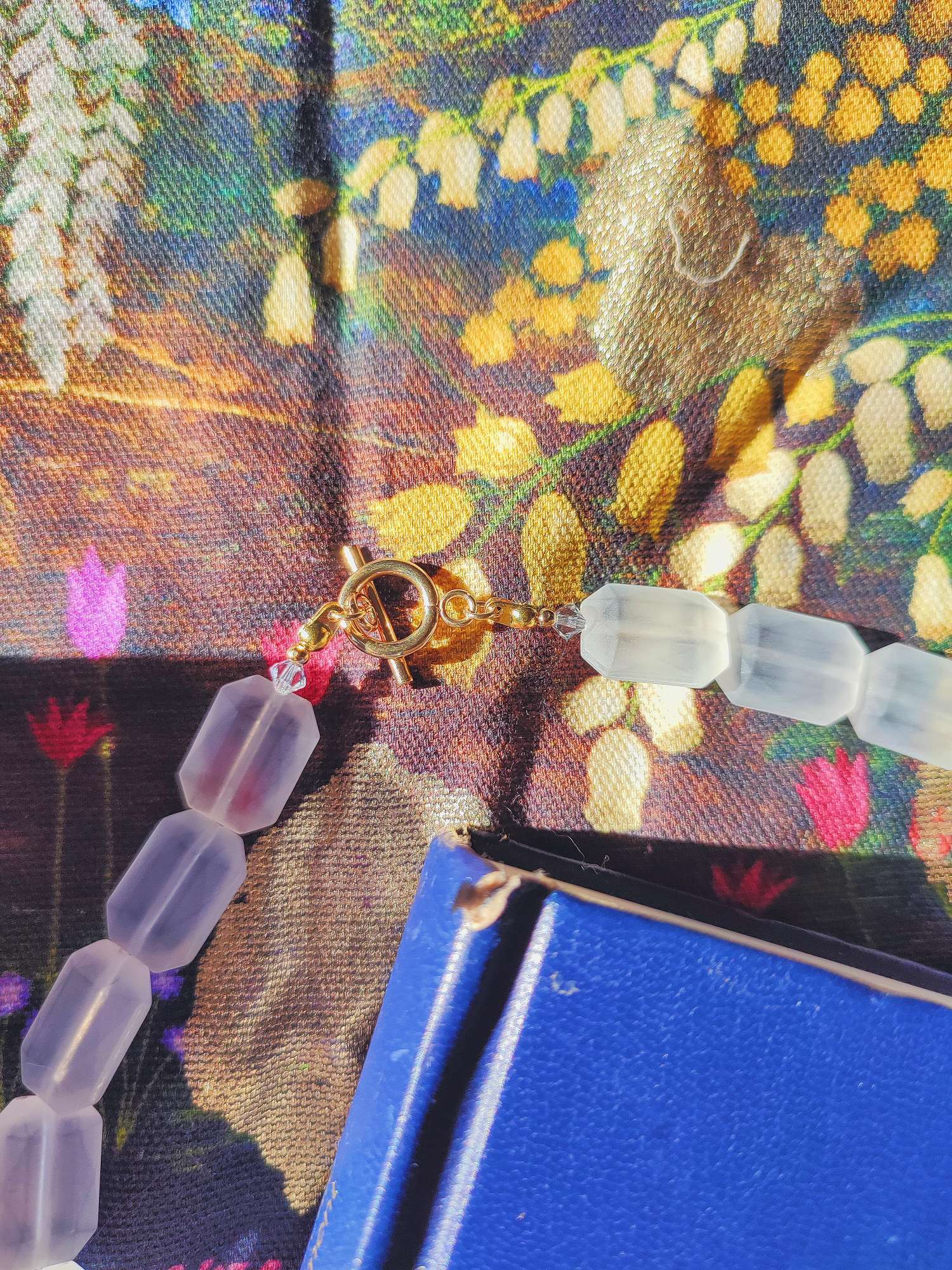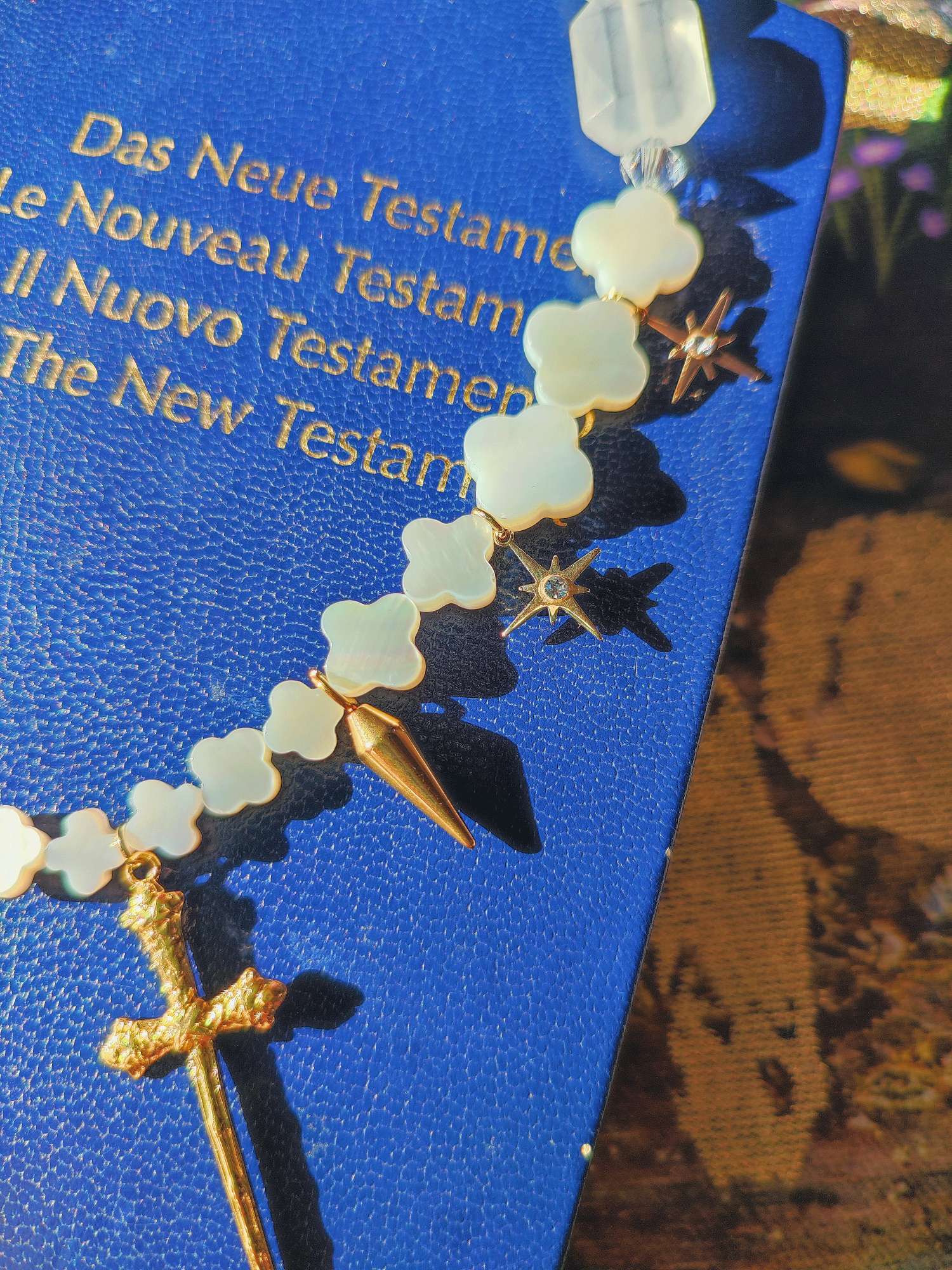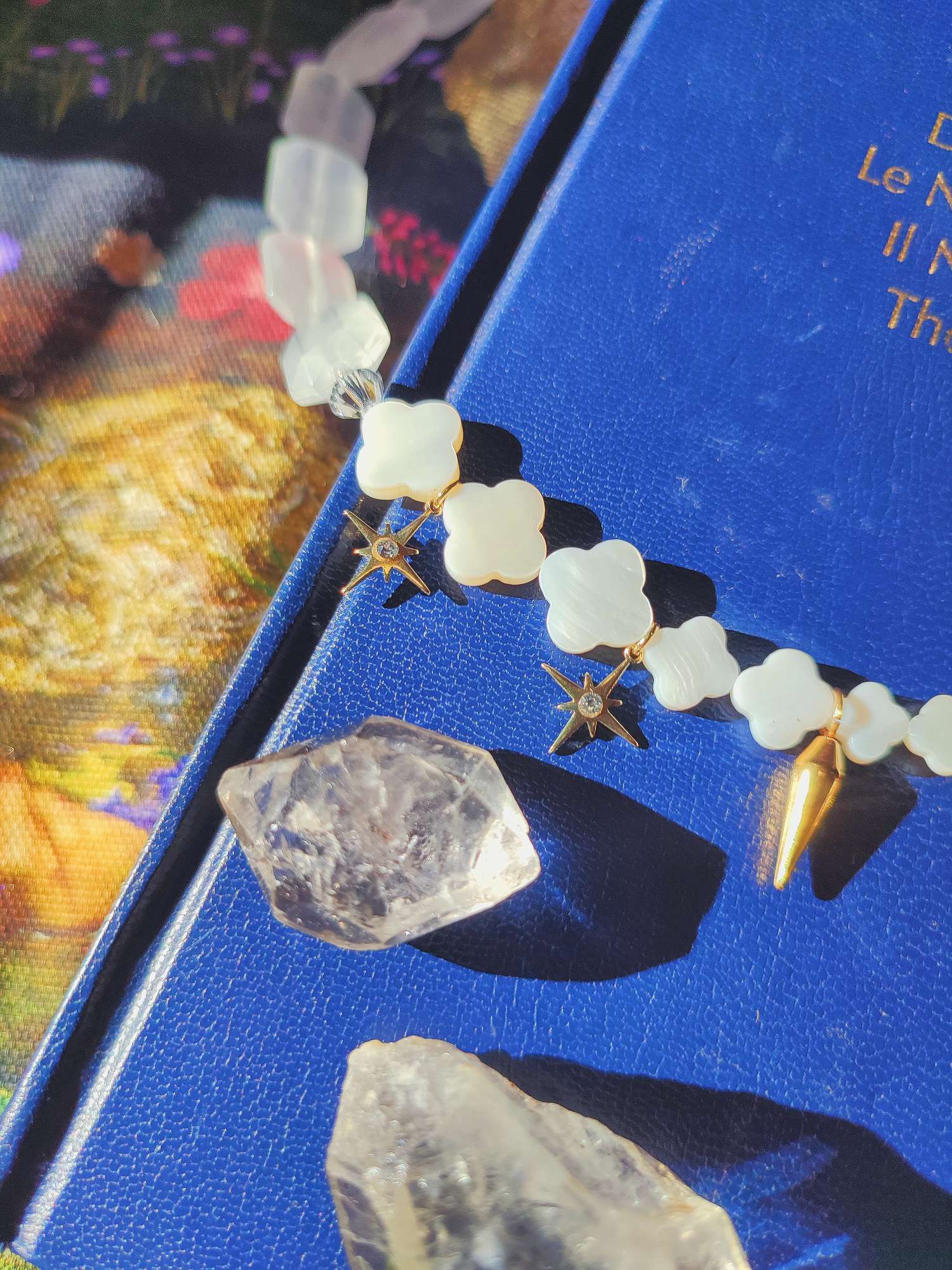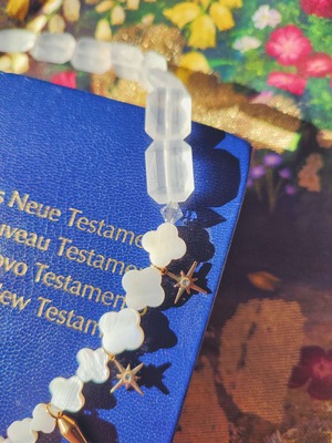 マザーオブパールのクローバービーズは大小をゆっくりと変化させながら並べました。母貝は古くから幸福と保護を願う素材として扱われ、クローバーの形と重なるとさらに穏やかな印象が広がります。古代ヨーロッパでは、貝の内側の光沢が聖樹の葉の輝きを模していると語られた逸話もあり、アクセサリーとしても縁起の良い組み合わせとされています。