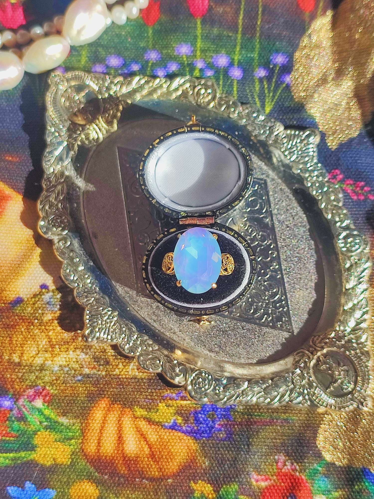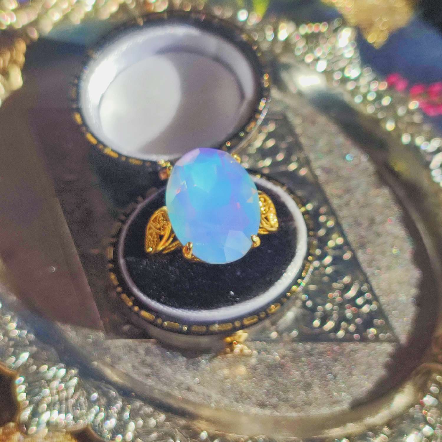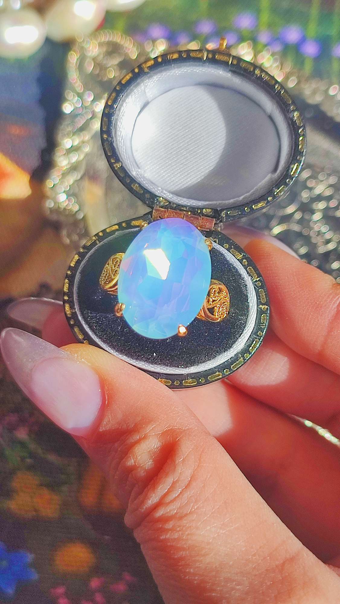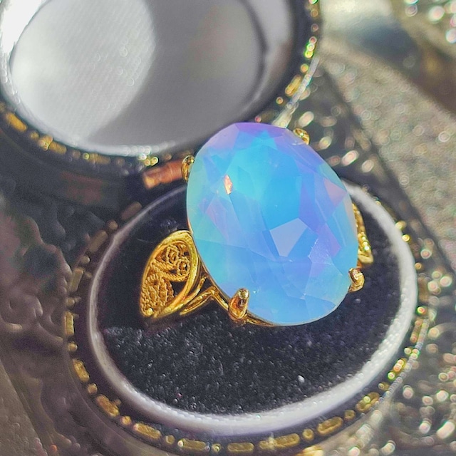 このリングには、ホワイトオパールヴィトレイルライトを使用しています。現在流通しているスワロフスキーの中でも最高級に位置づけられるカラーで、見る角度や光の入り方によって、乳白色の中に淡い青や紫、わずかな虹色が重なって見えるのが特徴です。はっきりとした発色ではなく、揺らぎのある光を内側に抱えたような色味に、妖艶さがあります。