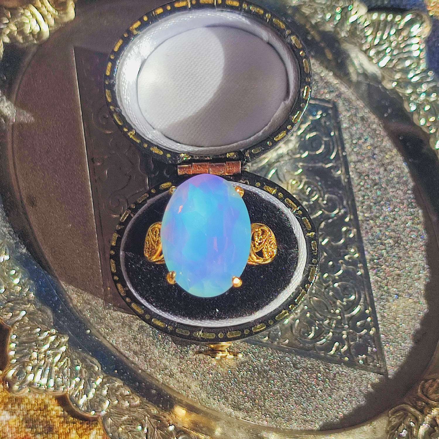 この石を主役に据えたリングとして構成を考え、全体をまとめました。華美になりすぎず、それでいて印象に残る佇まいになるよう仕上げています。日常の中で身につけたときに、光の変化そのものを楽しめるリングです。