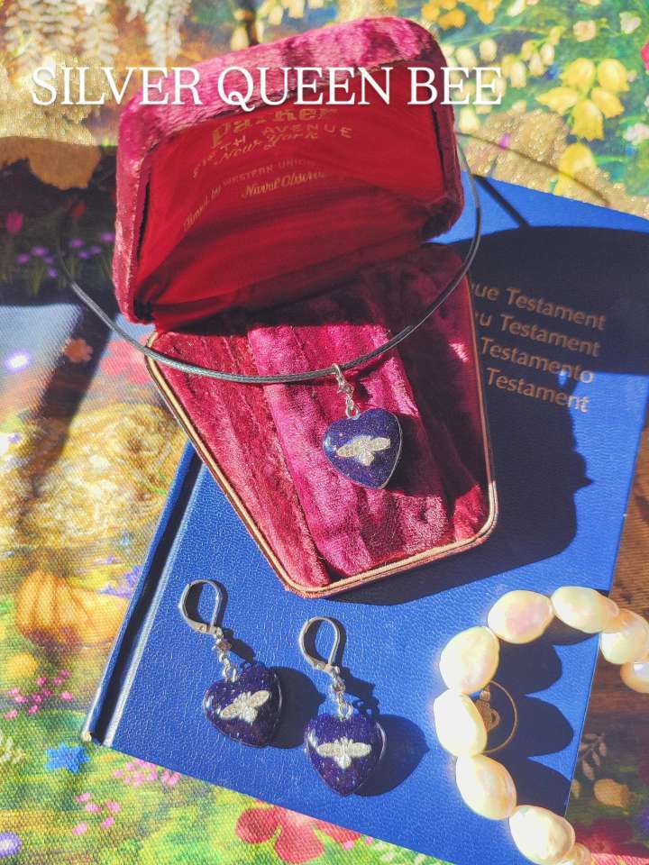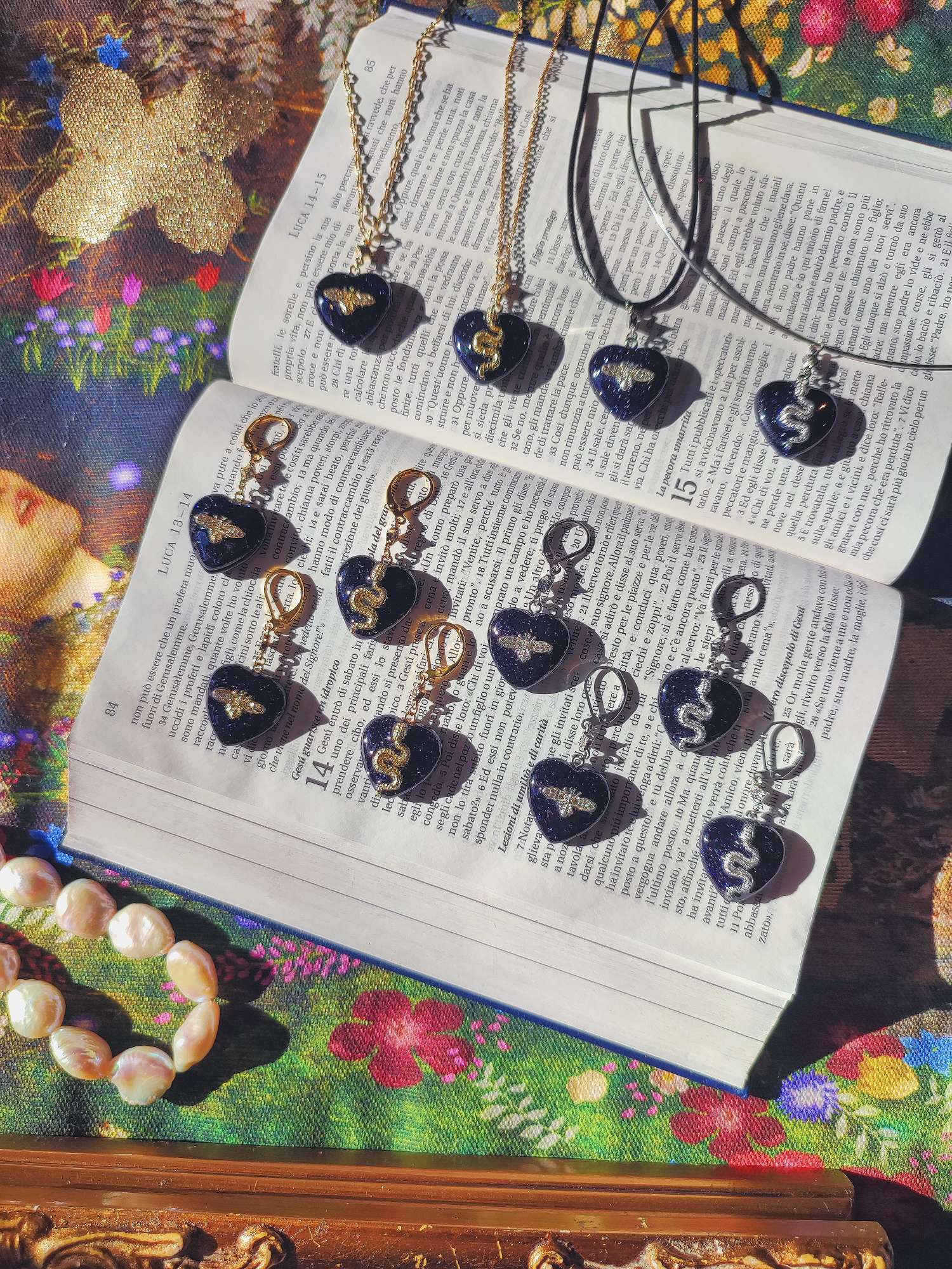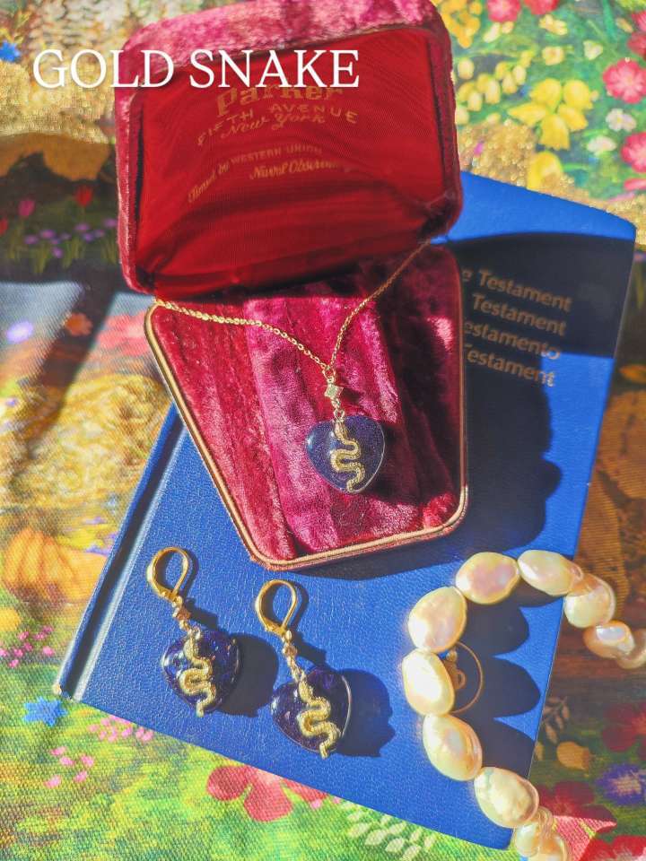 蛇は古くから再生と守護の象徴として大切にされ、蜂は勤勉と繁栄をもたらす存在として祝祭の飾りにも取り入れられてきました。クリスマスの祈りが集まる季節に、この2つのモチーフが放つ意味は不思議と心に馴染みます。調べていくうちに、その静かな力強さに惹かれ、ブルーサンドストーンのハートに合わせる形で自然と形にしていた作品です。