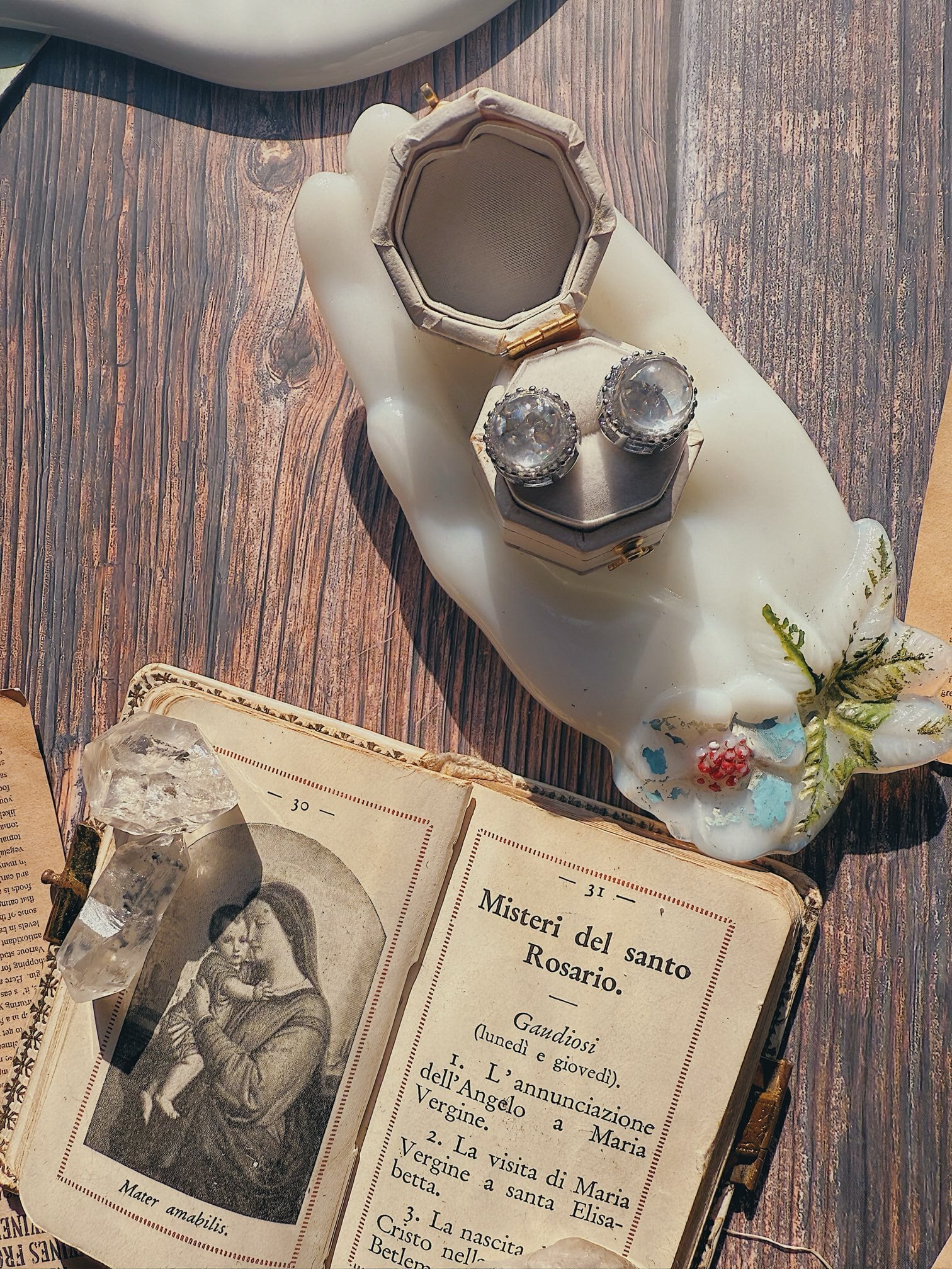 耳元で静かに揺れる半球型のガラスは、1910年代のフランスで生まれたアンティークガラスです。完全な円を目指す現代の工業製品とは異なり、当時の職人が感覚と経験を頼りに吹き上げたため、輪郭やカットにはわずかな揺らぎが残されています。その不均一さこそが、光を受けたときに単調ではない表情を生み出します。