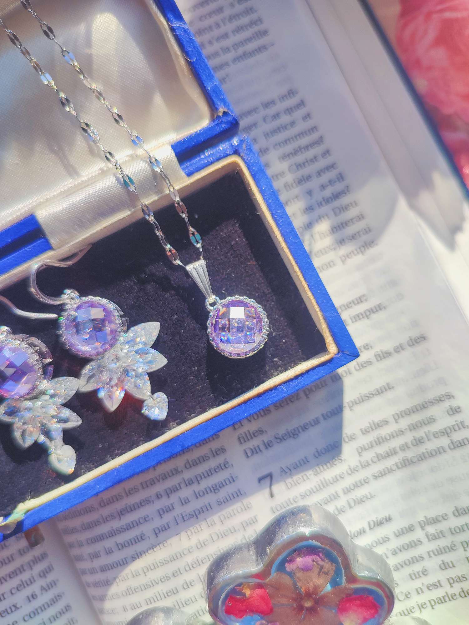 昼と夜のあいだにだけ現れる、短い時間の紫。トワイライトバイオレットという言葉が示すその曖昧な色を、耳飾りとネックレスに落とし込みました。