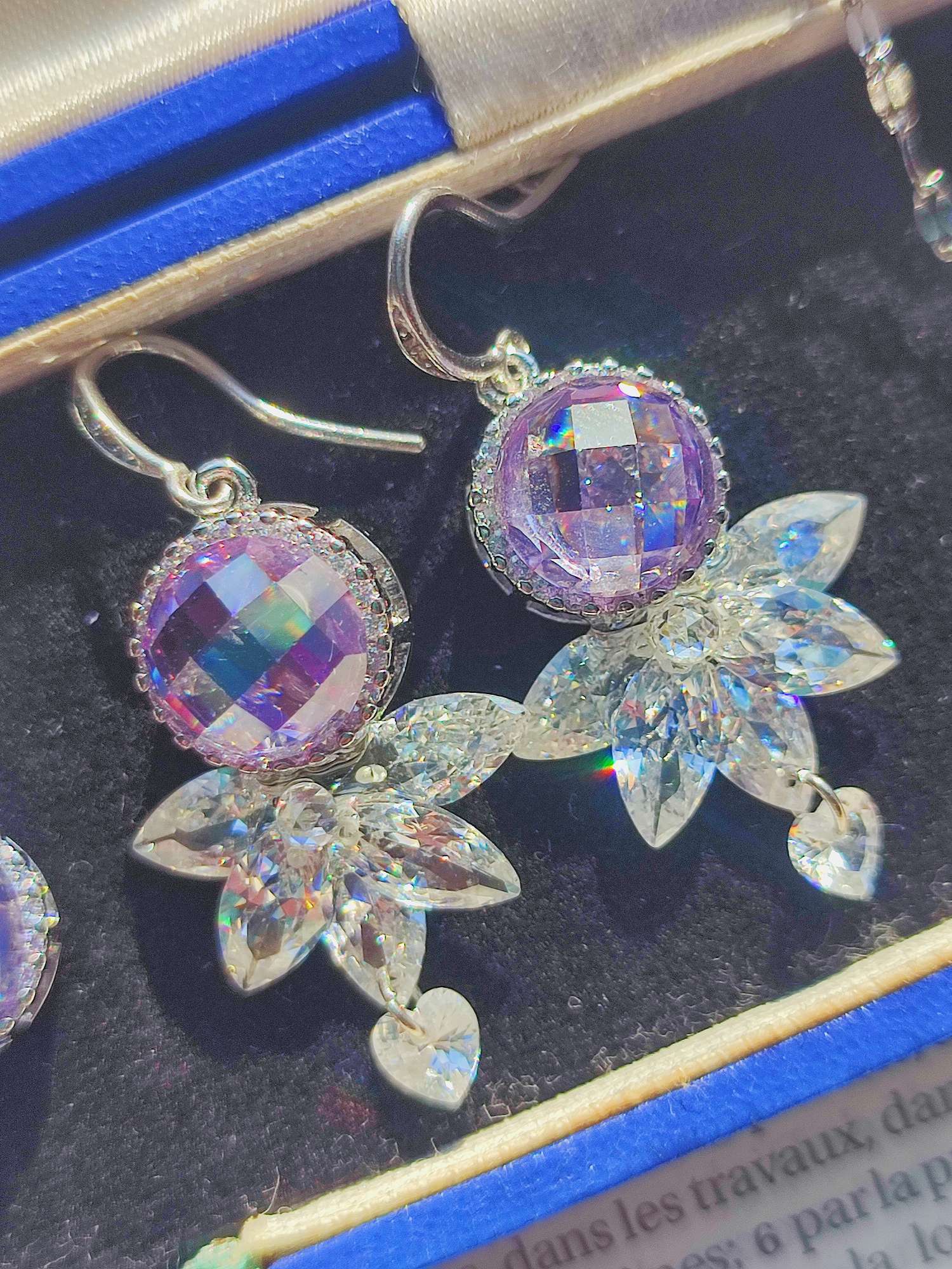 使用しているのは、パープルのローズカットのキュービックジルコニアと、マーキスカットのジルコニアです。ローズカットは18世紀頃に広まった古いカットで、強い輝きよりも、光を面で受け止める静かな反射が特徴です。そこにシャープなマーキス型を重ねることで、柔らかさと緊張感が同時に立ち上がるよう構成しています。
