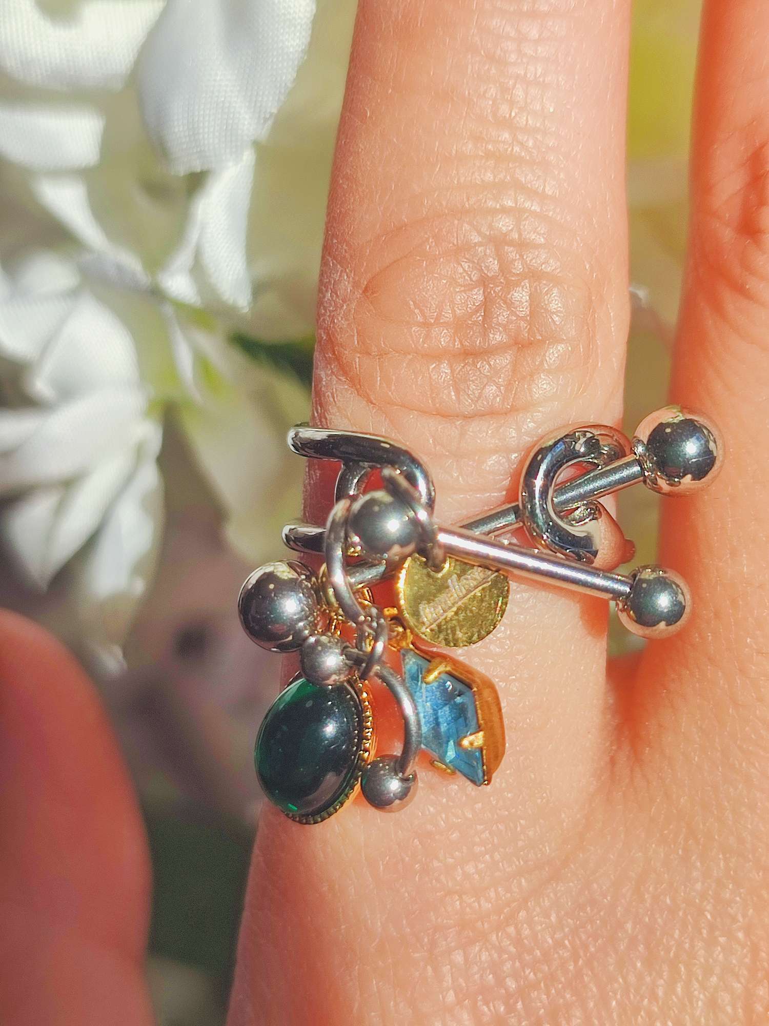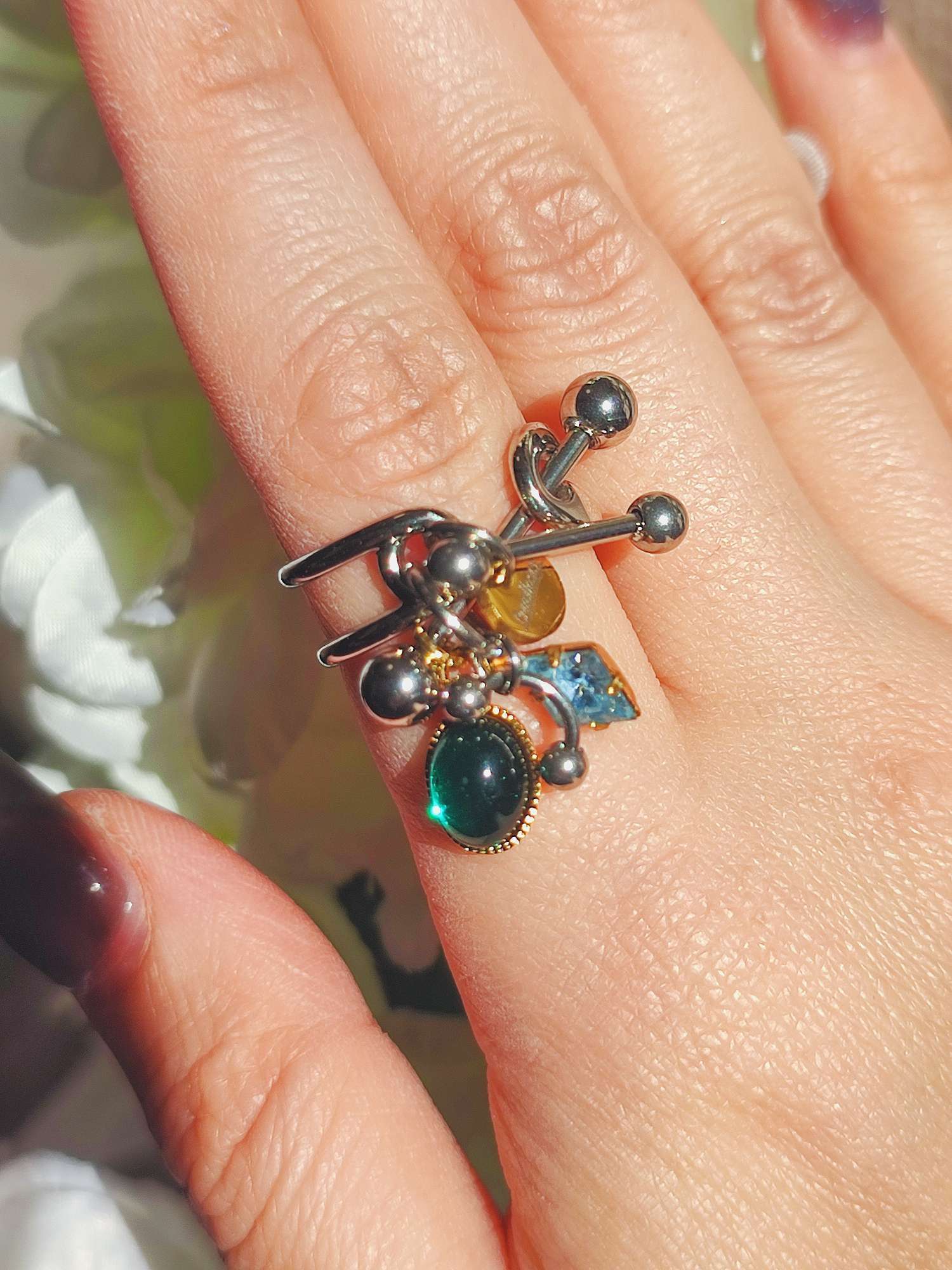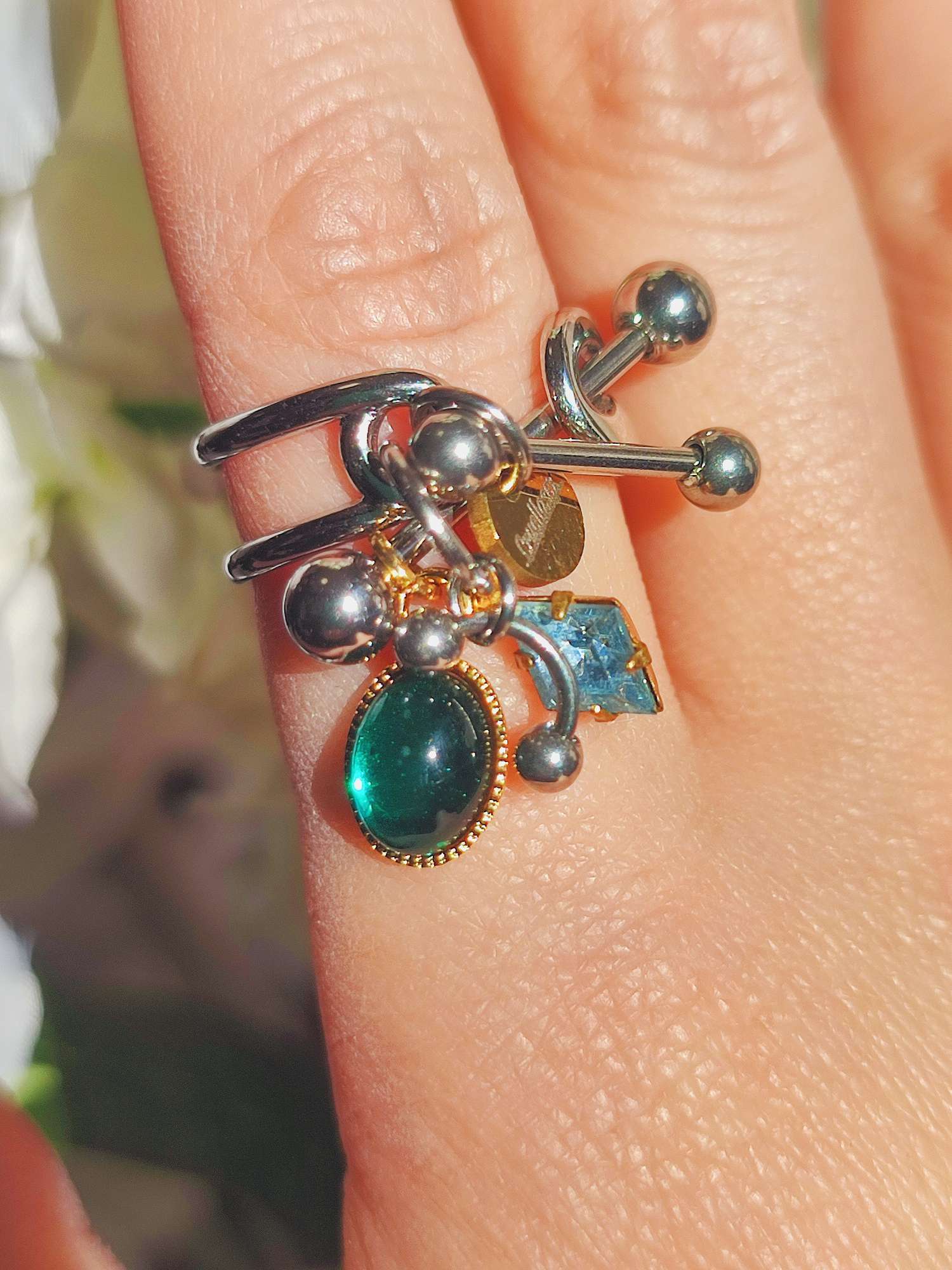 指先で小さく揺れるパーツが光を拾い、金属とガラスの色が重なります。ボディーピアスという少し異なる文化から生まれた構造を、指輪として楽しめる形へまとめたリングです。