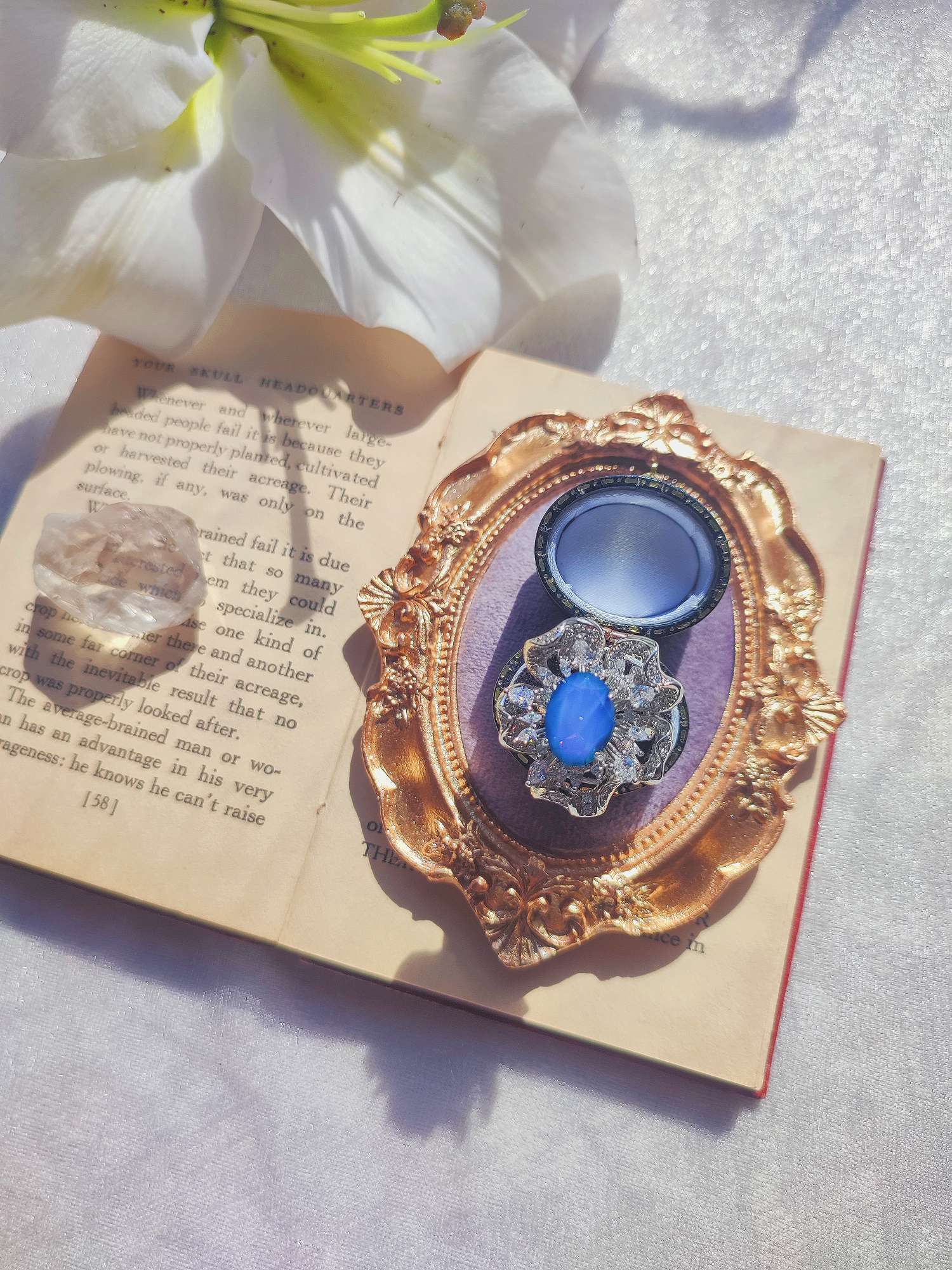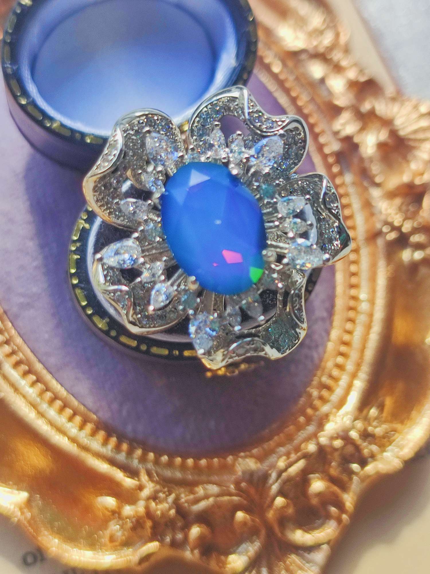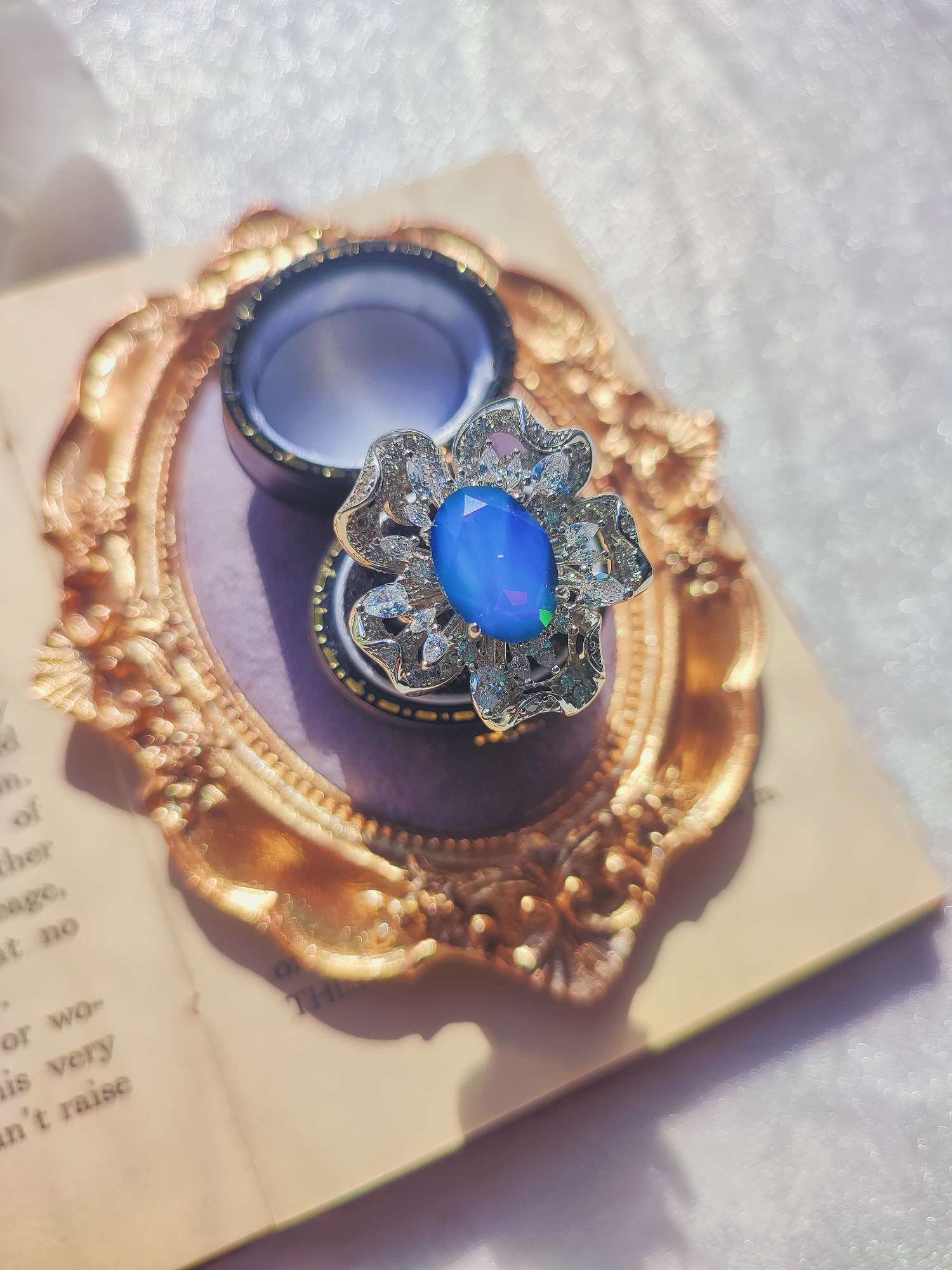 夜のアネモネのリング。中央に据えたのはブラックオパールヴィトレイルライトのスワロフスキーです。深い青の中にふと現れる緑や赤の光が、夜にひらく花の中心のように静かに色を変えていきます。