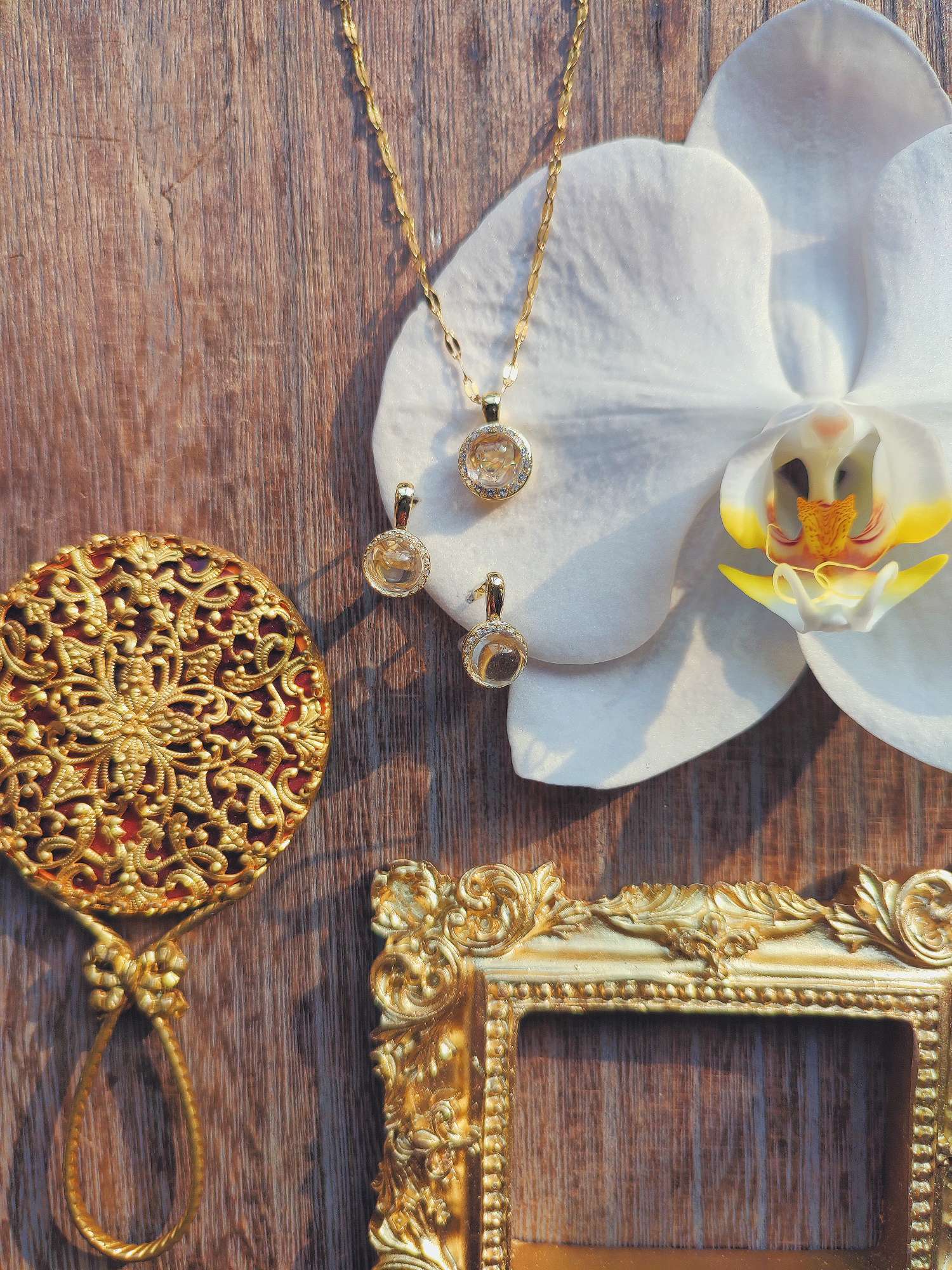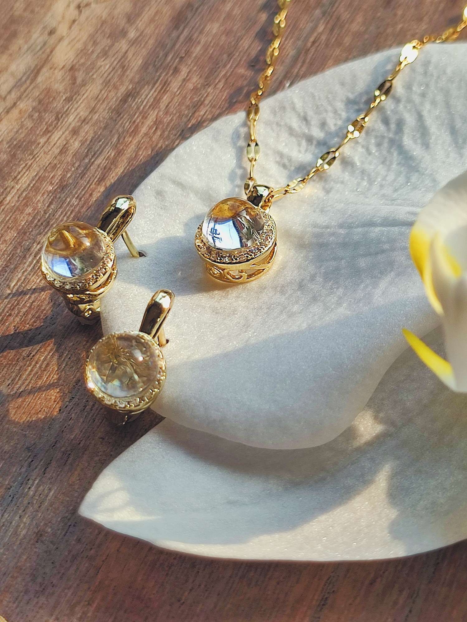 ネックレスと耳飾り、それぞれが同じ構造を持ちながら、身につける位置によって見え方が変わります。首元では静かに光を集め、耳元ではわずかな動きに合わせて揺らぎます。