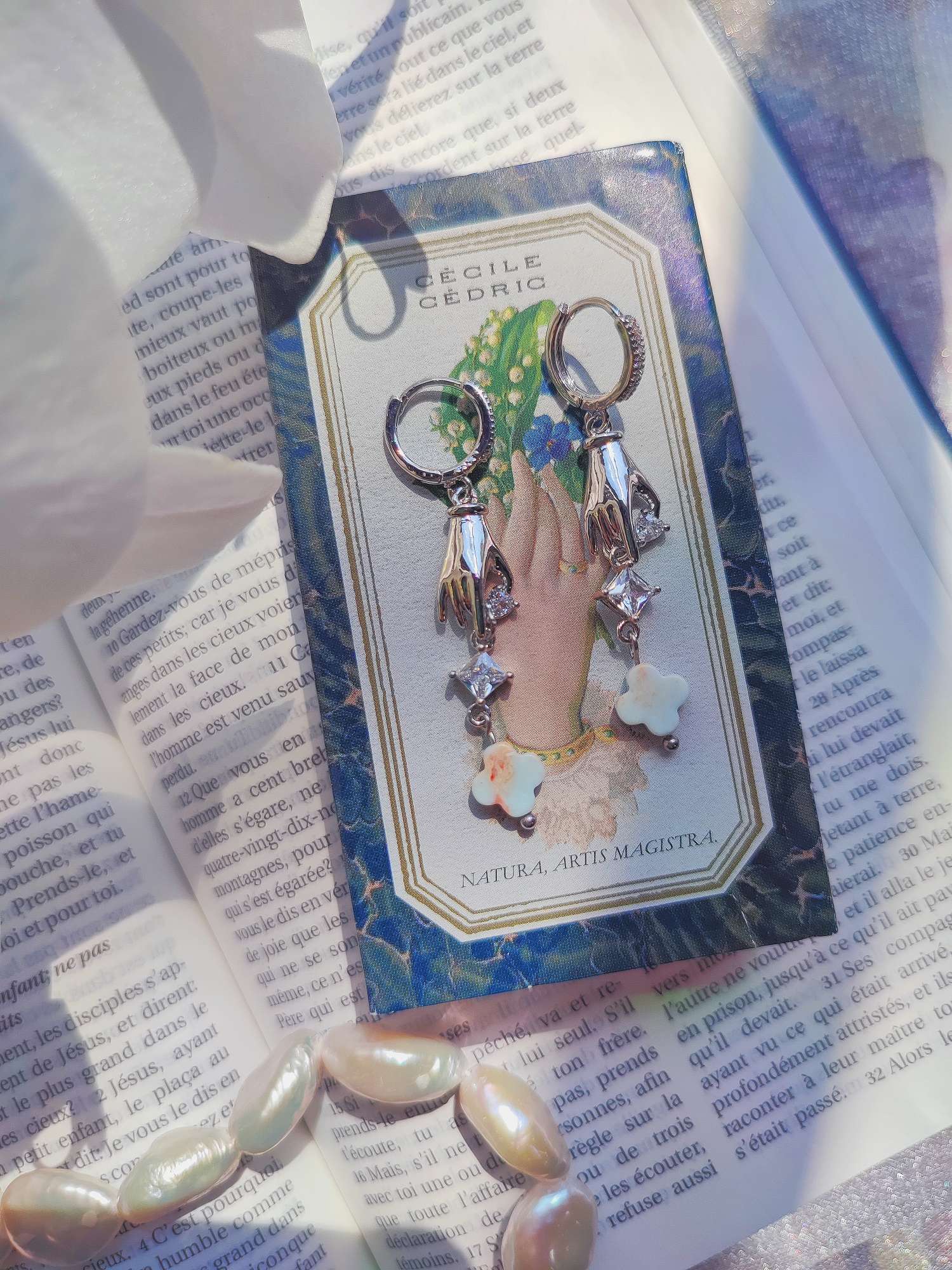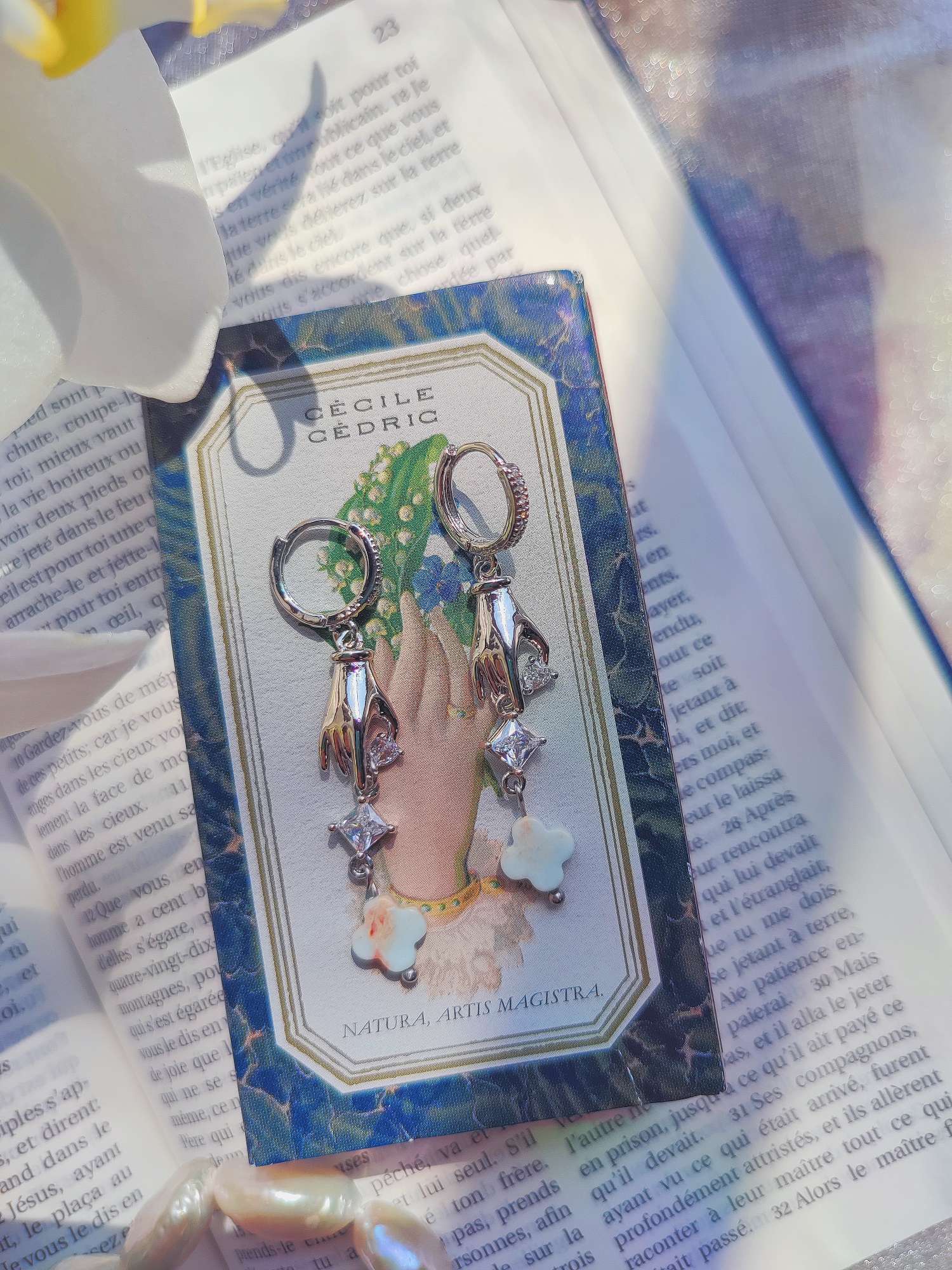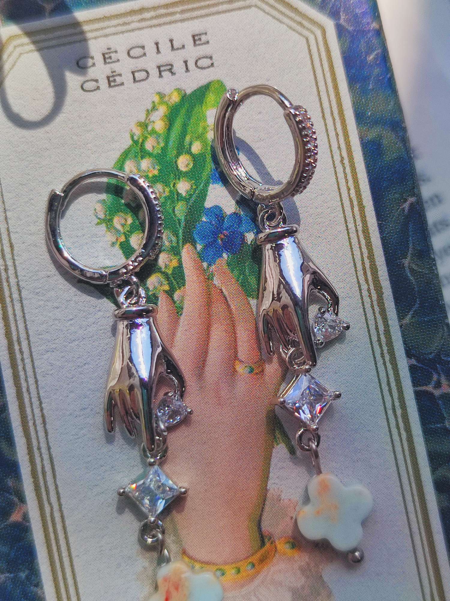 指先から伸びるのは、キュービックジルコニアとスネークスキンストーンのクローバーです。キュービックジルコニアは1970年代に実用化された人工石で、強い分散によって光を細かく反射し、揺れるたびに鋭いきらめきを生みます。石言葉としては純粋や永遠が知られており、均一で曇りのない輝きに由来しています。