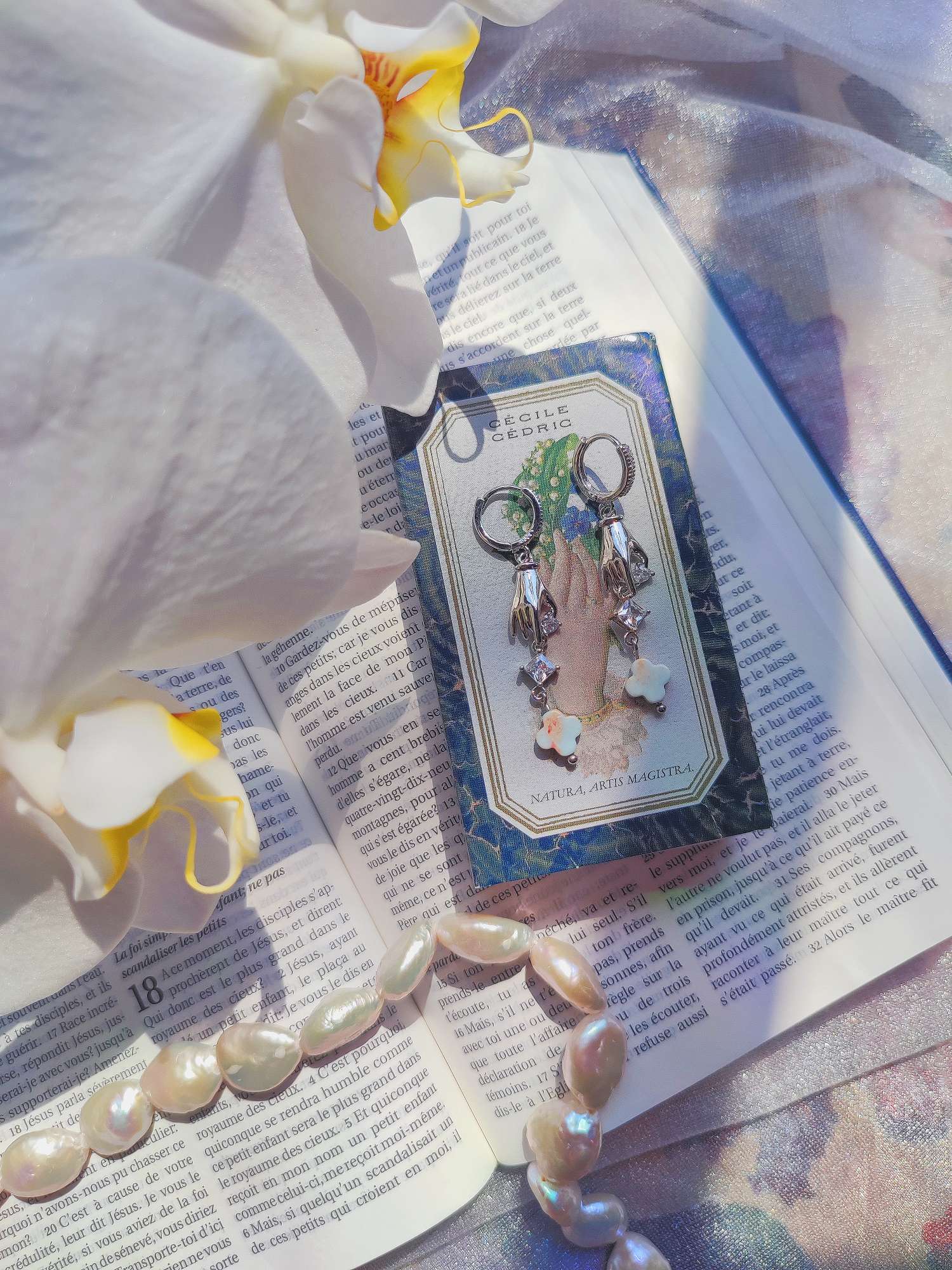 それぞれの石が独立して主張するのではなく、指先から連なる流れの中で役割を持つように配置しています。貴婦人の手というモチーフが静かに留まり、その先で石だけが揺れて光を変えるように、この耳飾りとしてまとめています。
